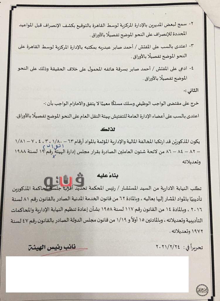 وأكد تقرير الإتهام أن المحالين إرتكبا المخالفة المالية والإدارية المؤثمة بالمواد أرقام 63 ـ 80/1 ـ 3 ـ 4 ـ 7 ـ 81/1 ـ 82 ـ 84 ـ 86، من لائحة شئون العاملين الصادرة بقرار رئيس مجلس إدارة هيئة النقل العام رقم 19 لسنة 1988 وتعديلاته