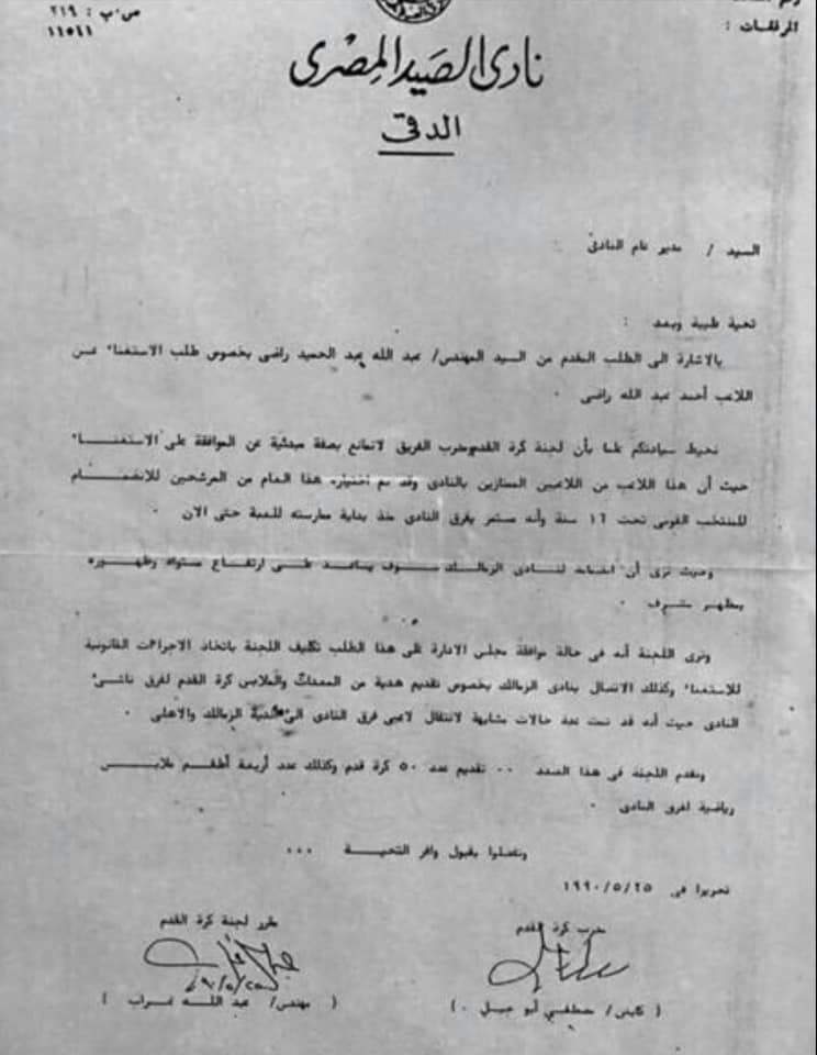 نشر الدكتور أحمد عبدالله، نجم الزمالك ومنتخب مصر السابق، خطاب موافقة نادي الصيد علي انضمامه للزمالك قبل 31 سنة.
