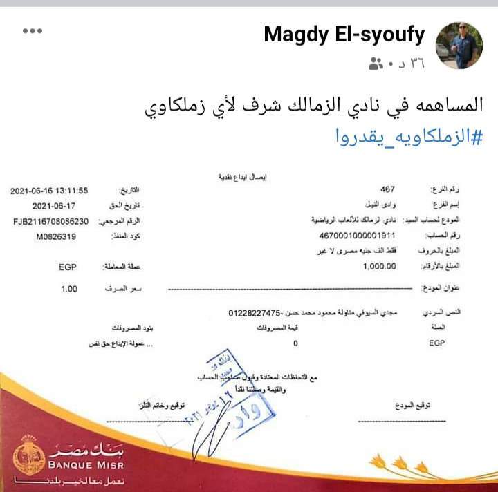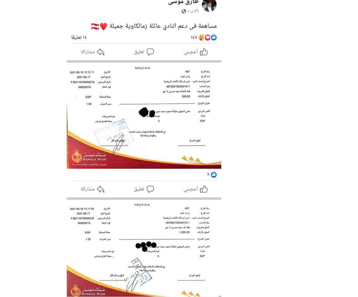 نشر عدد كبير من جماهير نادي الزمالك، صورا عبر حساباتهم الشخصية تفيد بقيامهم بالتبرع لحساب نادي الزمالك كمساهمة منهم لمساعدة النادي.