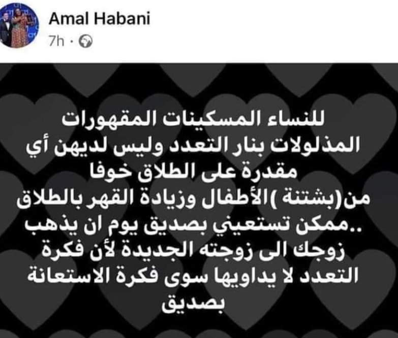 وبدأت القصة عندما كتبت أمل هباني، تدوينه على حسابها الخاص بموقع التواصل الاجتماعى قالت فيها:" للنساء المسكينات المقهورات المذلولات بنار التعدد وليس لديهن أي مقدرة على الطلاق خوفا من مسؤولية الأطفال وزيادة القهر بالطلاق .. ممكن تستعيني بصديق يوم أن يذهب زوجك إلى زوجته الجديدة لأن فكرة التعدد لا يداويها سوى فكرة الاستعانة بصديق".