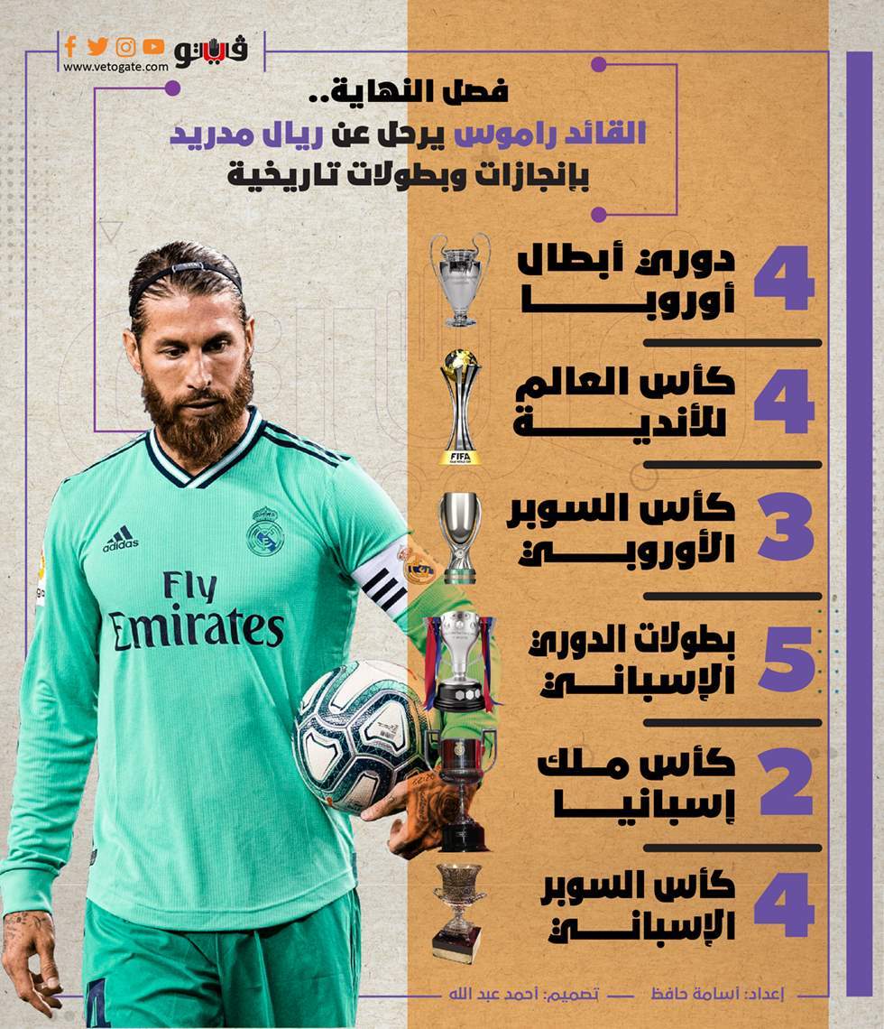 فصل النهاية.. القائد راموس يرحل عن ريال مدريد بإنجازات وبطولات تاريخية | إنفوجراف