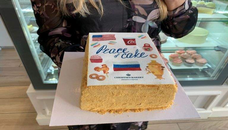 وكُتب أعلى الكعكة باللون الأزرق الداكن عبارة "بيس أوف كيك" إلى جانب علمي البلدين ورموز لهما، عبارة عن دمية وإبريق لتحضير الشاي لروسيا وكوكاكولا وحلوى مارشميلو للولايات المتحدة.