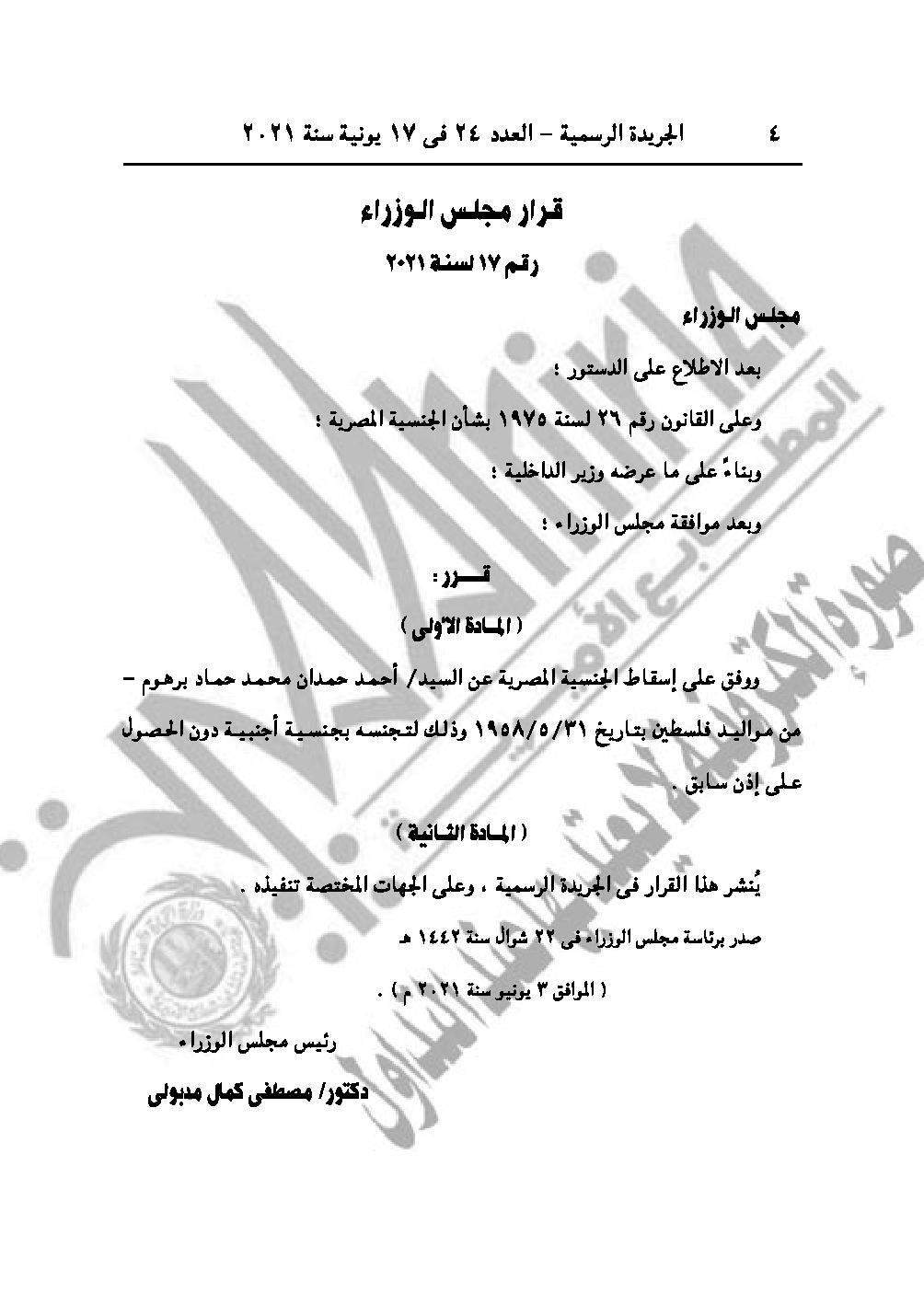 القرار رقم 17 لسنة 2021، بالموافقة على إسقاط الجنسية المصرية عن أحمد حمدان محمد حماد برهوم، من مواليد فلسطين بتاريخ 31/5/1985، وذلك لتجنسه بجنسية أجنبية دون الحصول على إذن سابق.