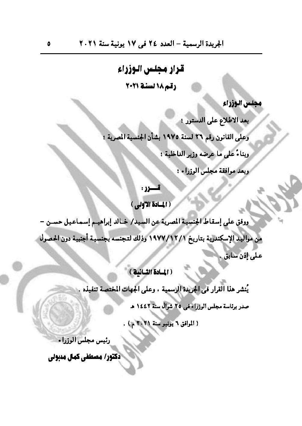 والقرار رقم 18 لسنة 2021، بالموافقة على إسقاط الجنسية المصرية عن خالد إبراهيم إسماعيل حسن، من مواليد الإسكندرية بتاريخ 1/12/1977، وذلك لتجنسه بجنسية أجنبية دون الحصول على إذن سابق.