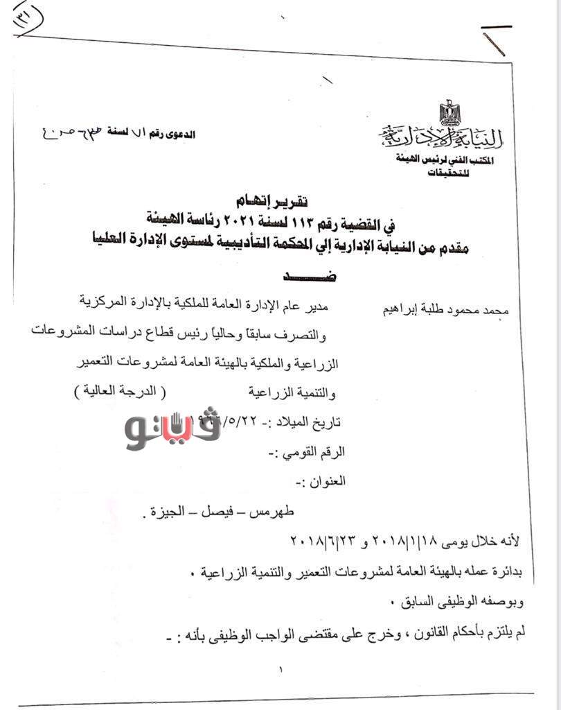 محمد محمود طلبة، رئيس قطاع دراسات المشروعات الزراعية والملكية بالهيئة العامة لمشروعات التعمير والتنمية الزراعية لم يلتزم خلال فترة عمله مديرًا عامًا للإدارة العامة للملكية يومي 18 يناير عام 2018 و 23 يونيه 2018، بأحكام القانون وخرج على مقتضى الواجب الوظيفي.