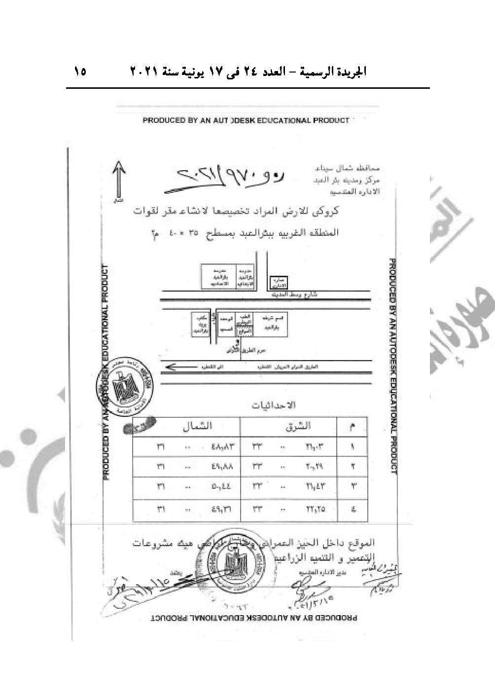 -القرار رقم 970 لسنة 2021 بتخصيص قطعة أرض من أملاك الدولة الخاصة الكائنة بجوار قسم شرطة بئر العبد بمحافظة شمال سيناء، بالمجان، لإقامة مقر فرقة شرطة المنطقة الغربية عليها.