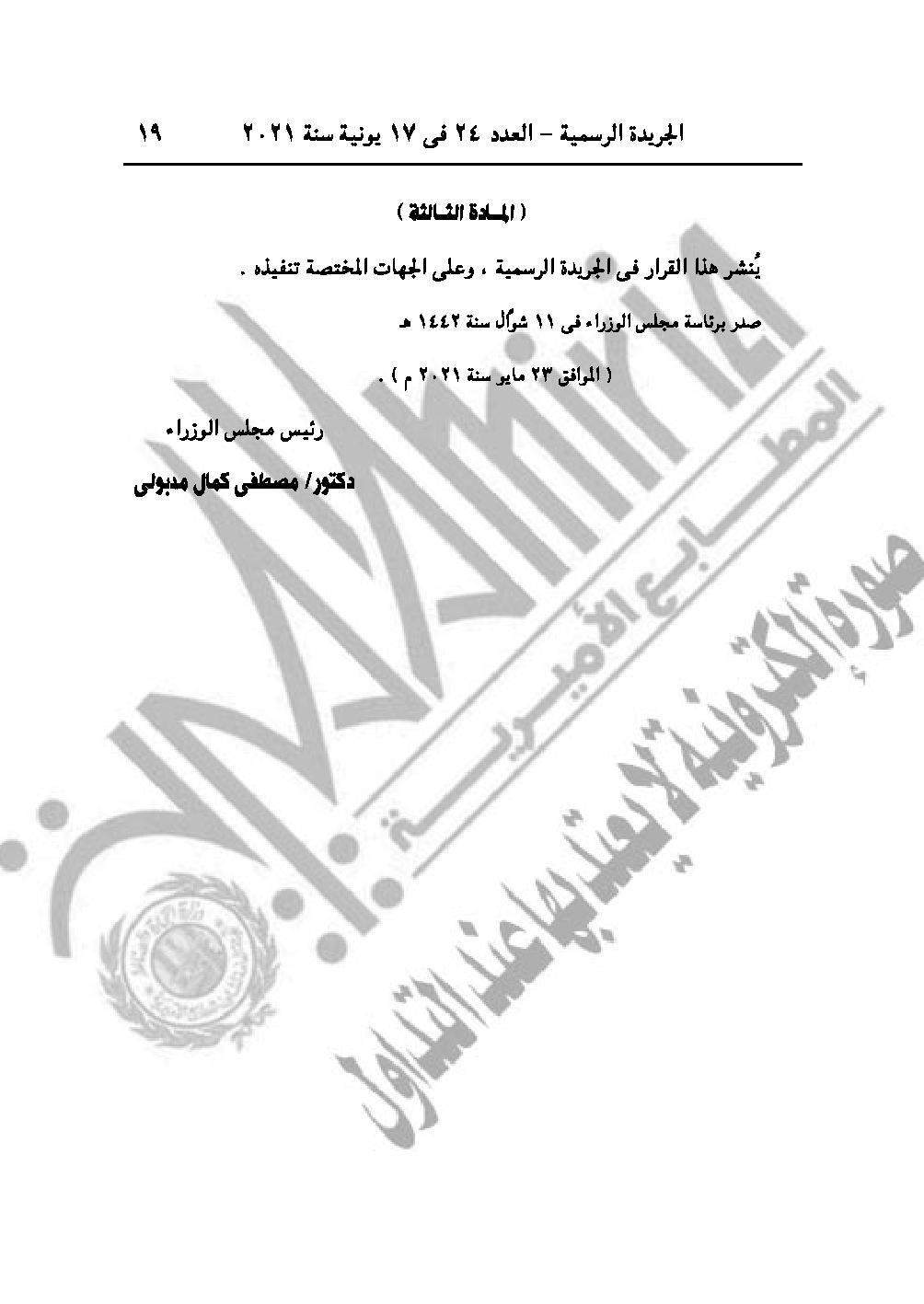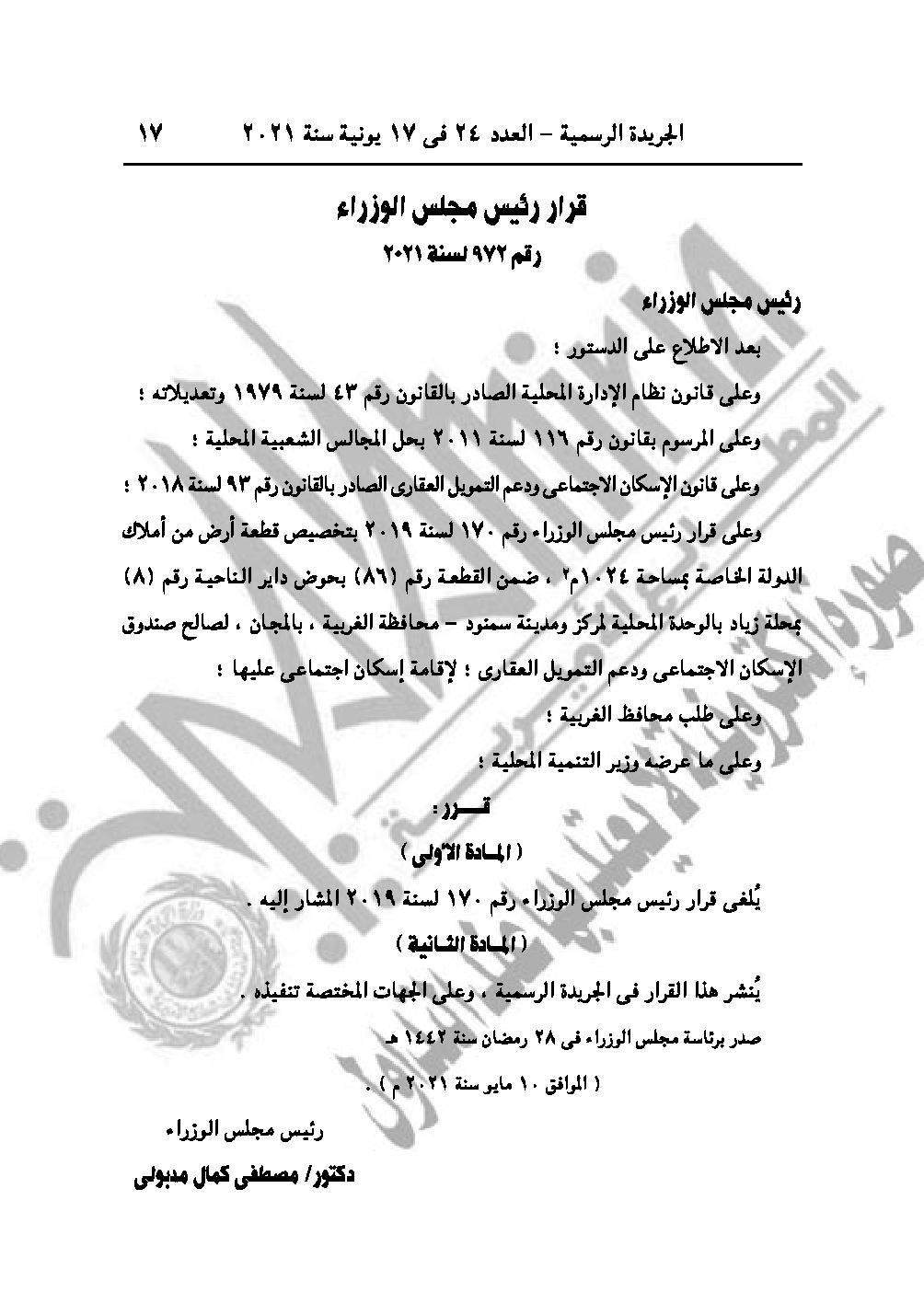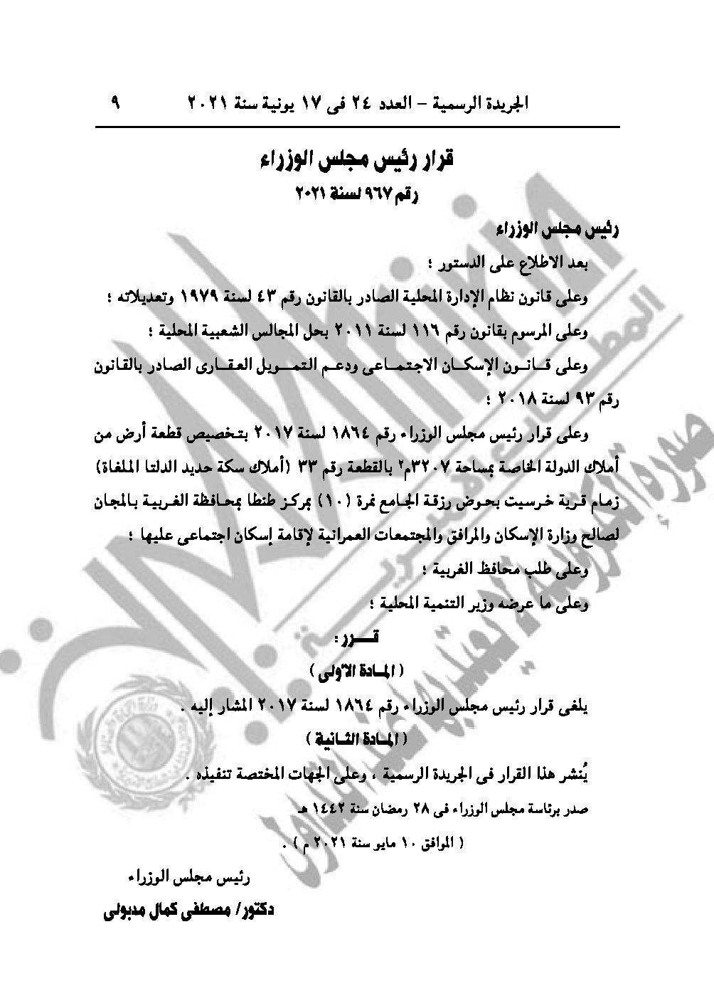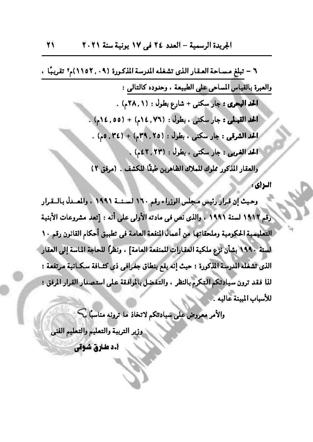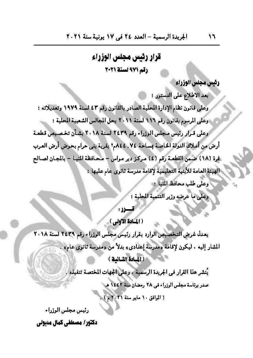 -القرار رقم 971 لسنة 2021، بتعديل غرض التخصيص الوارد بقرار رئيس مجلس الوزراء رقم 2439 لسنة 2018، ليكون لإقامة مدرسة إعدادية بدلًا من مدرسة ثانوي عام.