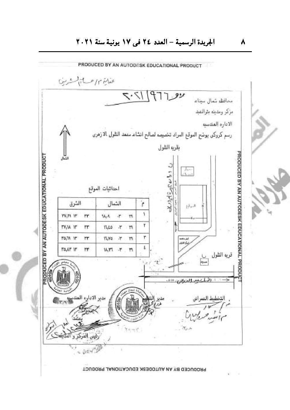 -القرار رقم 966 لسنة 2021 بتخصيص قطعة أرض من أملاك الدولة الخاصة بقرية التلول، مركز مدينة بئر العبد بمحافظة سيناء، بالمجان، لإقامة معهد التلول الأزهري عليها.