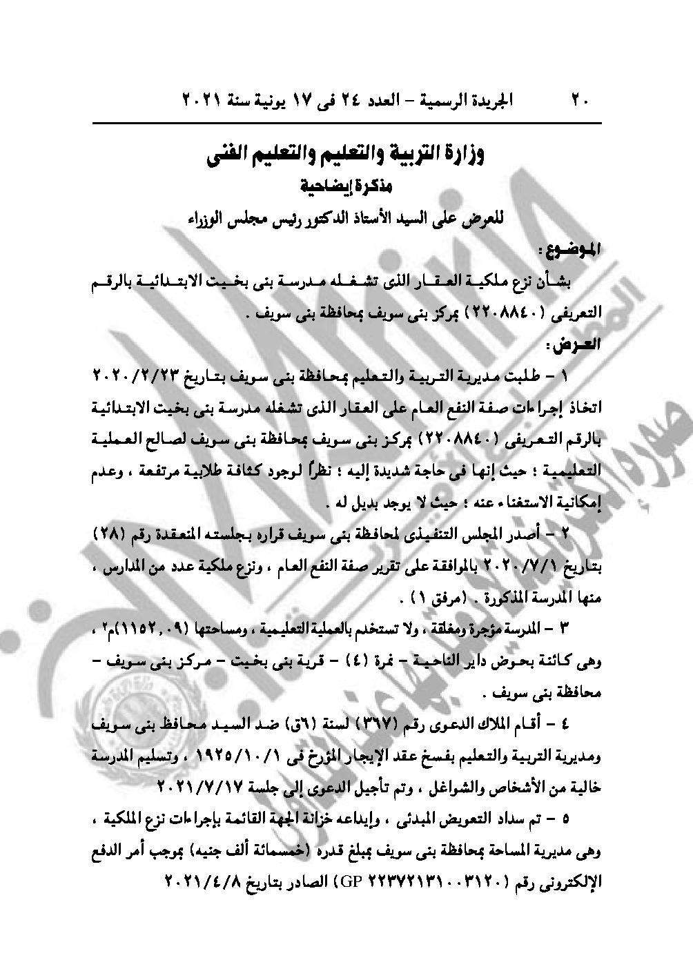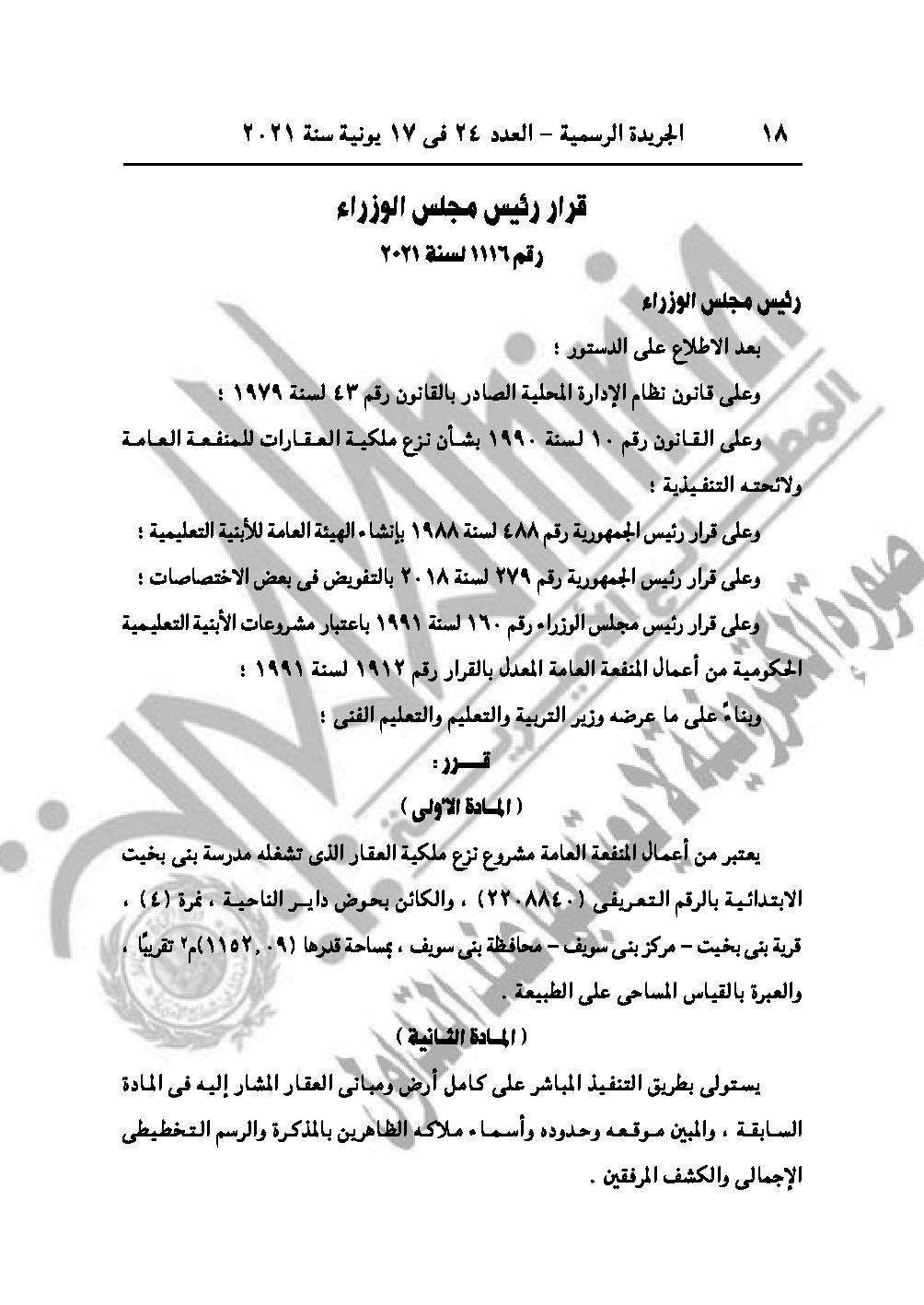 - القرار رقم 1116 لسنة 2021، باعتبار مشروع نزع ملكية العقار الذي تشغله مدرسة بني بخيت الابتدائية، والكائن بحوض داير الناحية، نمرة (4) قرية بني بخيت مركز بني سويف من أعمال المنفعة العامة.