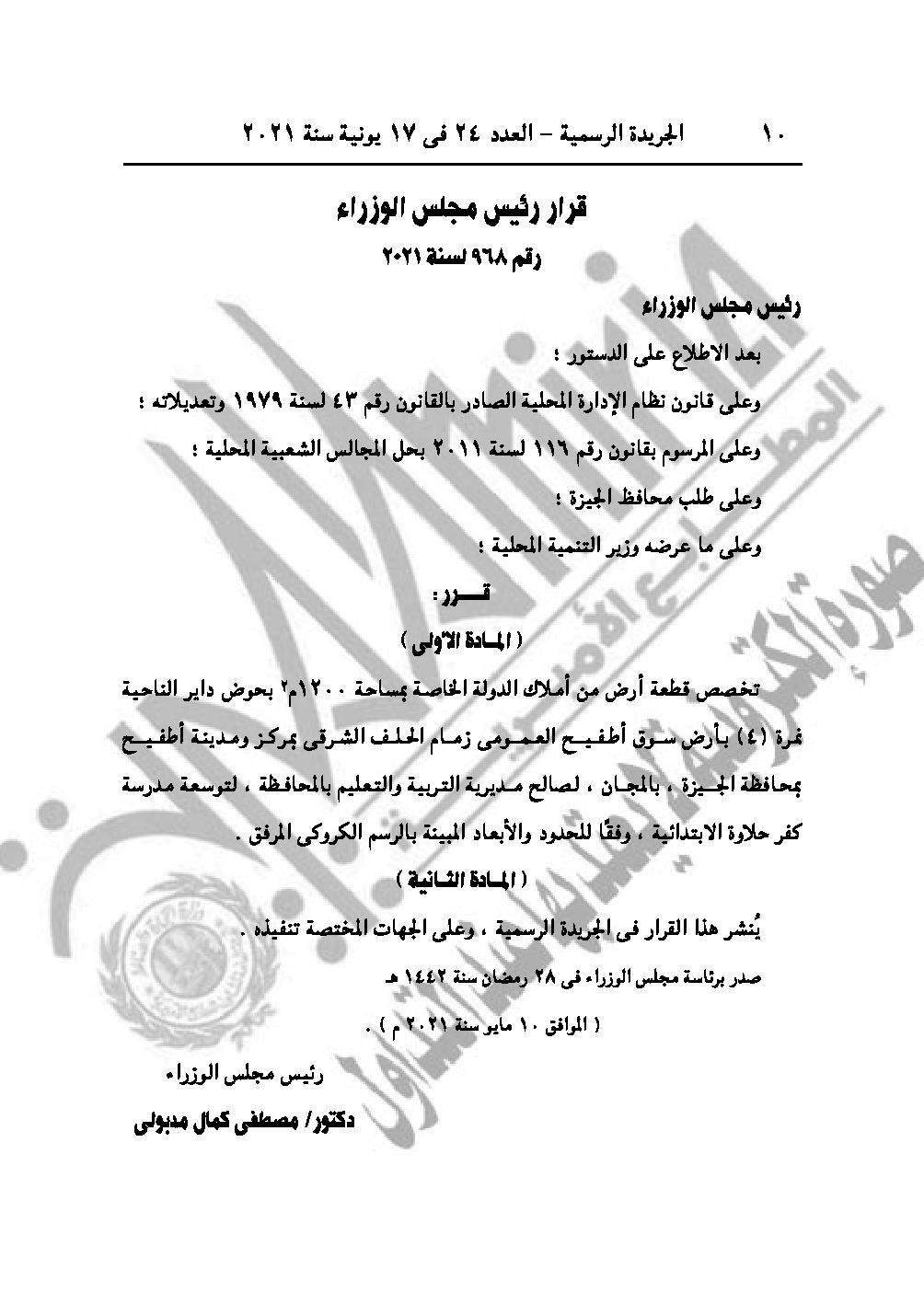 -القرار رقم 968 لسنة بتخصيص قطعة أرض من أملاك الدولة الخاصة بأرض سوق أطفيح العمومي زمام الحلف الشرقي بمركز ومدينة أطفيح بمحافظة الجيزة، بالمجان، لتوسعة مدرسة كفر حلاوة الابتدائية.