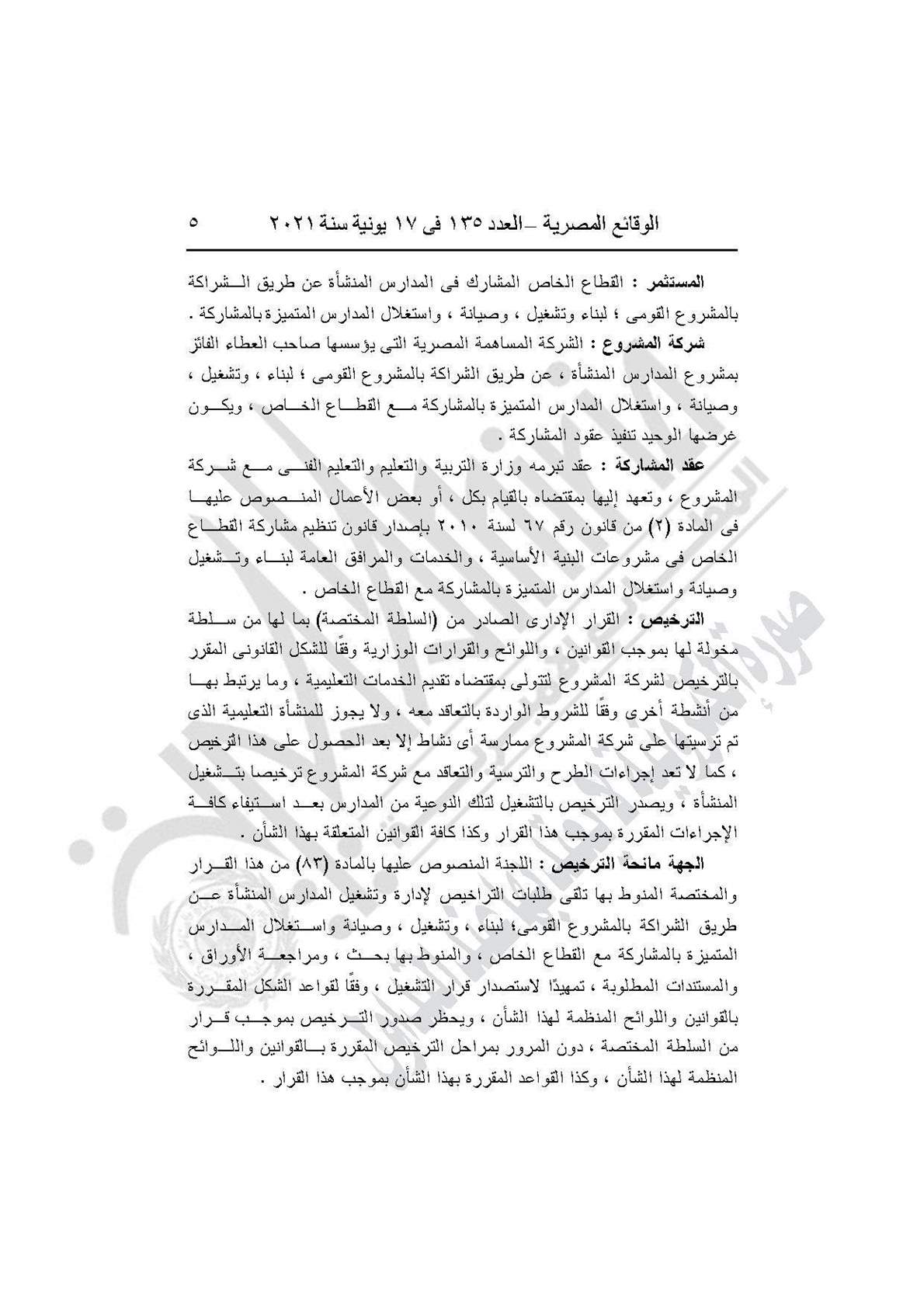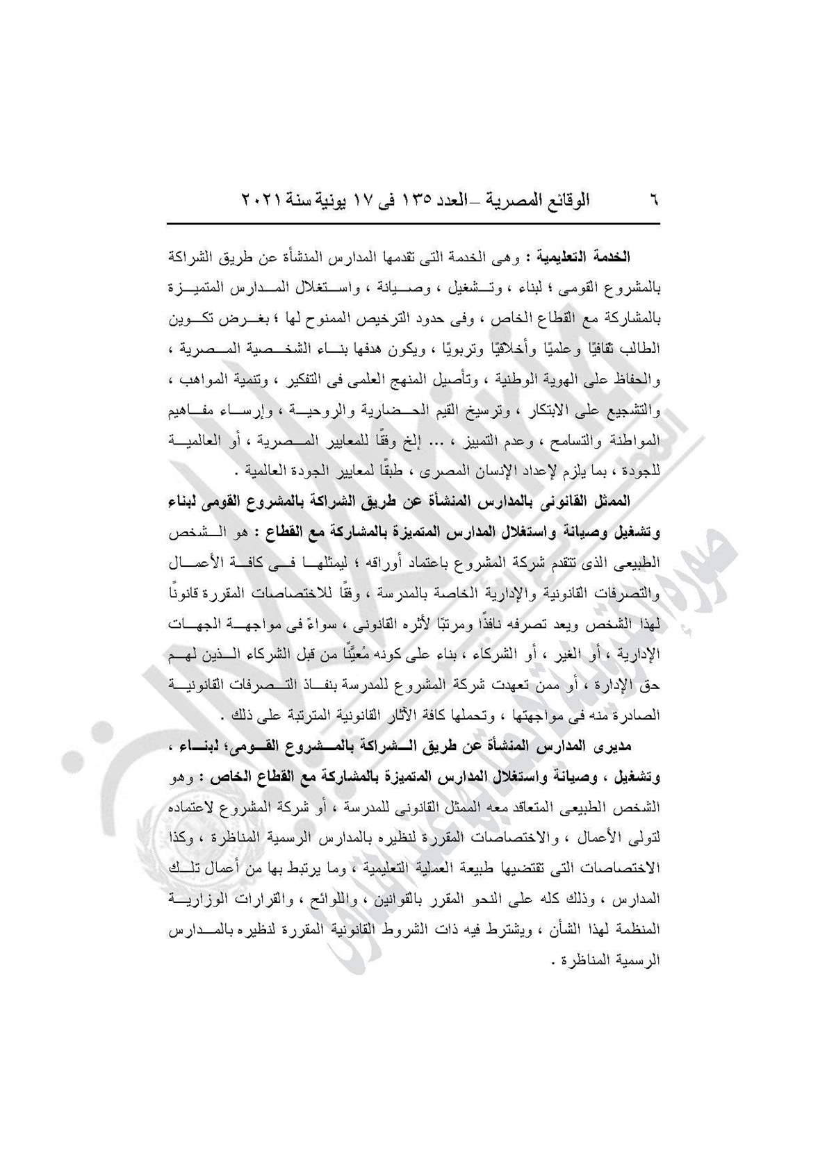ويقصد بالمدارس المنشأة عن طريق الشراكة بالمشروع القومي لبناء وتشغيل وصيانة واستغلال المدارس المتميزة بالمشاركة مع القطاع الخاص، المدارس التي يتم بناؤها بالمشاركة بين الدولة وبين القطاع الخاص، وفقًا لأحكام ونصوص القانون رقم 67 لسنة 2021 ولائحته التنفيذية.