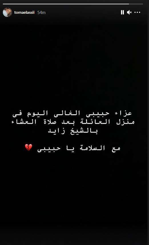 وكتبت توما العاصي عبر خاصية الاستوري قائلة: "عزاء حبيبي الغالي اليوم في منزل العائلة بعد صلاة العشاء بالشيخ زايد.. مع السلامة يا حبيبي".