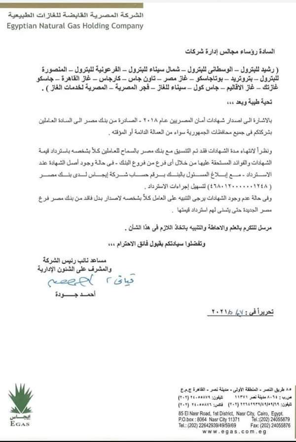 ووجه أحمد جودة مساعد نائب رئيس ايجاس والمشرف على الشئون الإدارية خطاب لرؤساء مجالس إدارات الشركات رشيد للبترول ، الوسطاني للبترول، شمال سيناء للبترول، الفرعونية للبترول، المنصورة للبترول، بتروتريد، بوتاجاسكو، غاز مصر ، تاون جاس، كارجاس، غاز القاهرة، جاسكو، غازتك، غاز الأقاليم ، جاس كول، سيناء للغاز، فجر المصرية، المصرية لخدمات الغاز وذلك لاخطار العاملين بانتهاء مدة الشهادات.