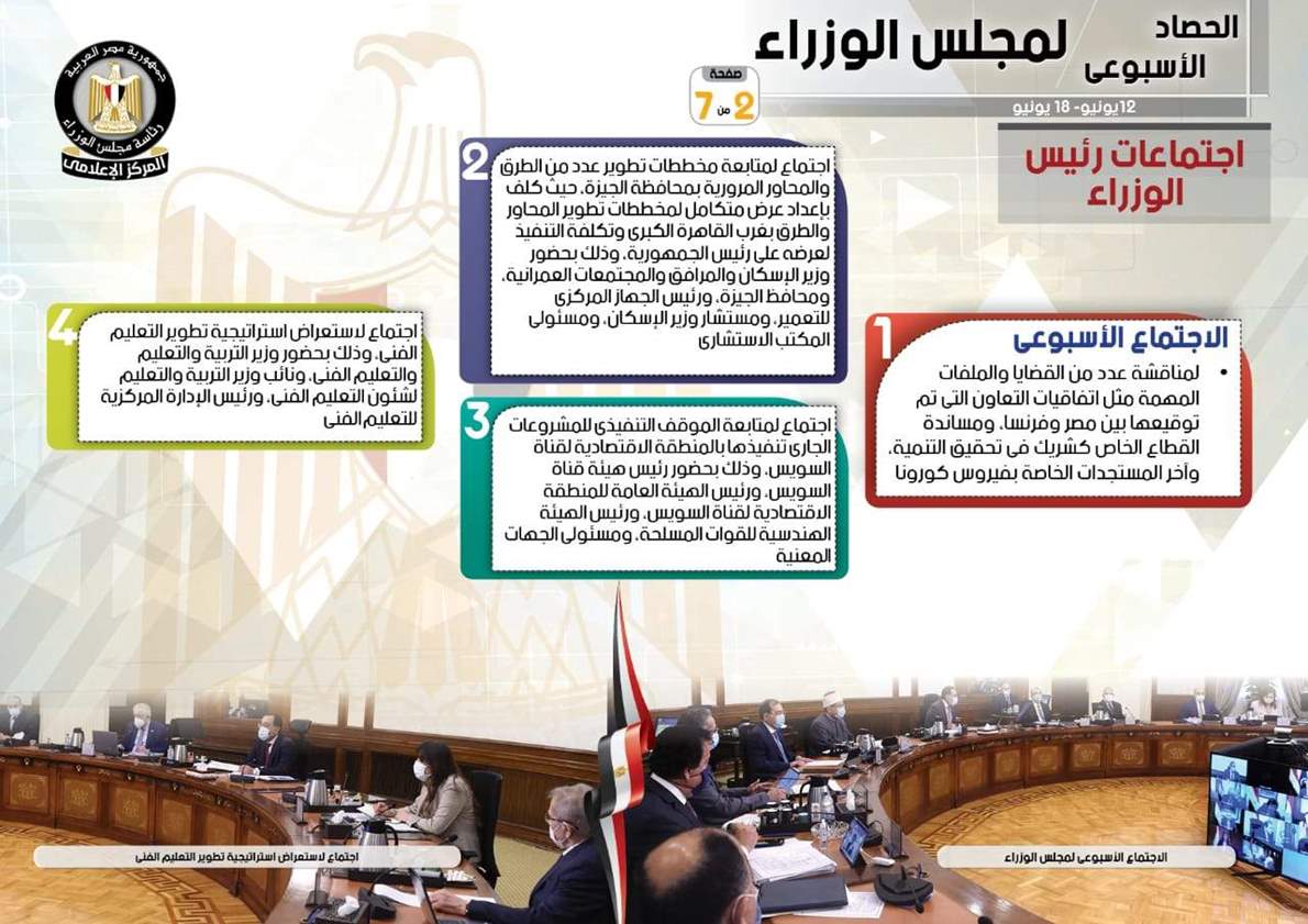 نشر المركز الإعلامي لمجلس الوزراء، تقريراً شمل إنفوجرافات سلط من خلالها الضوء على الحصاد الأسبوعي لمجلس الوزراء، وذلك خلال الفترة من 12 حتى 18 يونيو 2021، والذي تضمن الموافقة على عدد من القرارات، فضلاً عن الاجتماعات واللقاءات التي عقدها الدكتور مصطفى مدبولي، رئيس مجلس الوزراء، بالإضافة إلى ما قام به