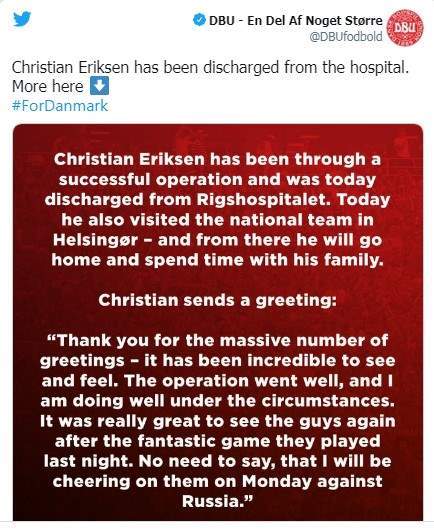 أعلن الاتحاد الدانماركي لكرة القدم، خروج كريستيان إريكسن لاعب وسط الفريق من المستشفى اليوم الجمعة.