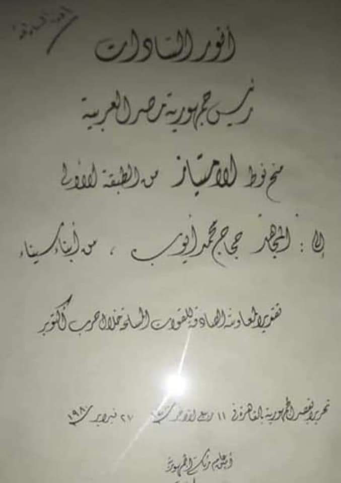 وأشار نجل المجاهد حجاج الكاشف أن البطل حاصلا على نوط الامتياز من الطبقة الأولى من رئيس الجمهورية أنور السادات.