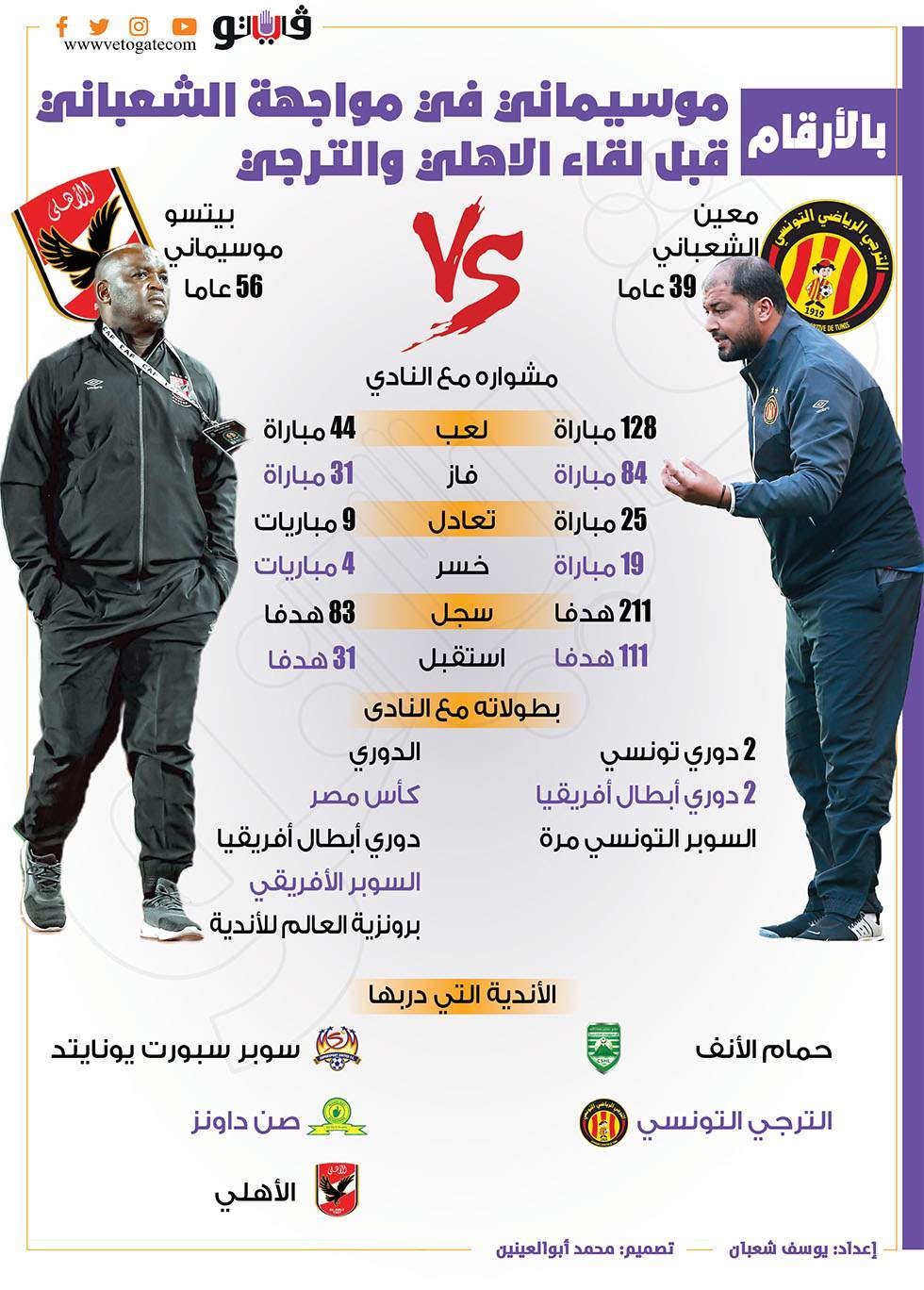 تستعرض فيتو فى السطور التالية أرقام المدير الفني للأهلي الجنوب أفريقي بيتسو موسيماني قبل مواجهة الغد المرتقبة، بالإضافة إلى أرقام معين الشعباني المدرب الوطني لفريق الترجي التونسي.