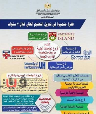 وأكد التقرير أن الوزارة حققت إنجازات متنوعة بمجال تدويل التعليم ، حيث تم دعم خطة استكمال تشييد جامعات العاصمة الإدارية الجديدة التى أصبحت بدورها طفرة فى عالم الذكاء الاصطناعي والتطور التكنولوجى، بالإضافة لتلقي الوزارة بالفعل الموافقة من مجلس الوزراء على قانون تنظيم العمل بالفروع الدولية بالجامعات؛ إذ يساعد القانون الدارسين في الحصول على شهادة الجامعة الأم في بلدها الأصلي، وتم التوسع في إنشاء فروع لجامعات أجنبية مرموقة بالعاصمة الإدارية الجديدة وشملت ( فرع جامعة الأمير ادوارد الكندية، فرع جامعة كوفنتري البريطانية، فرع جامعة هيرتفوردشاير البريطانية، فرع لكل جامعة من جامعتي (لندن ووسط لانكشاير) داخل مصر).
