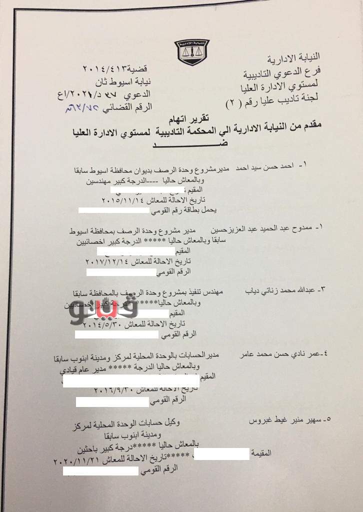 وتضمن تقرير الاتهام أن أحمد حسن سيد، مدير مشروع وحدة الرصف بديوان محافظة أسيوط أهمل في الإشراف على أعمال مهندسي قسم الهندسة المدنية بمشروع الرصف مما ترتب عليه إعداد مستخلصات عمليات رصف مركز أبنوب قبل مباشرة أعمال الرصف فعليًا، ووقع ممدوح عبد الحميد عبد العزيز، مدير مشروع وحدة الرصف بديوان محافظة أسيوط على 6 محاضر استلام ابتدائي بما يفيد تسليم الشوارع للوحدة المحلية بأبنوب رغم عدم إتمام أعمال الرصف فعليًا.