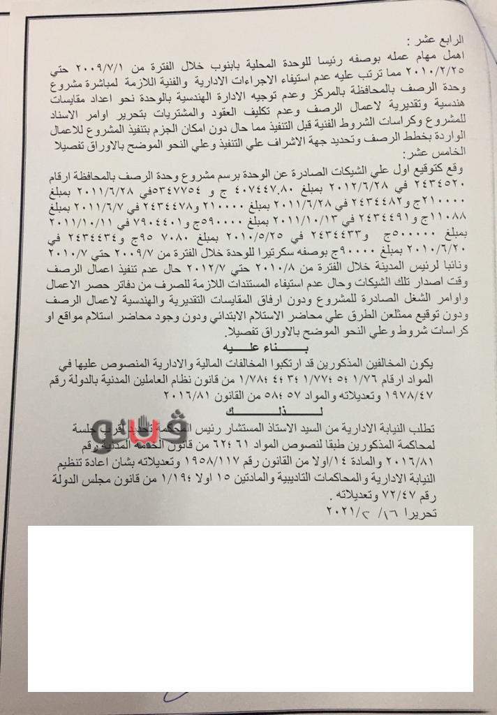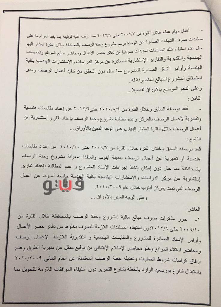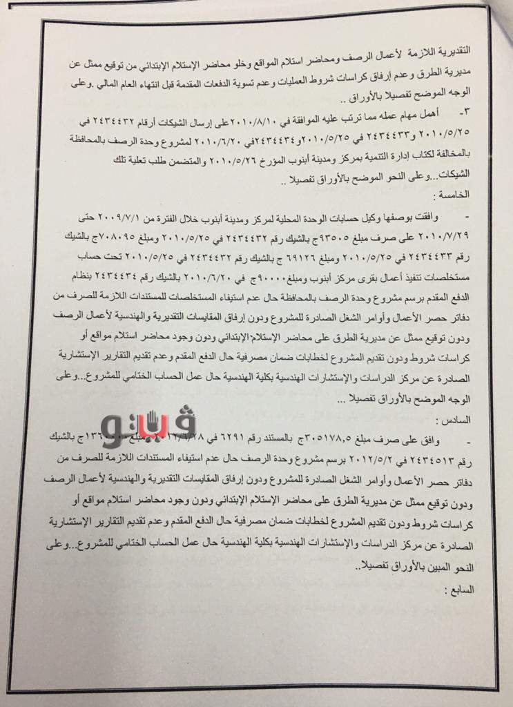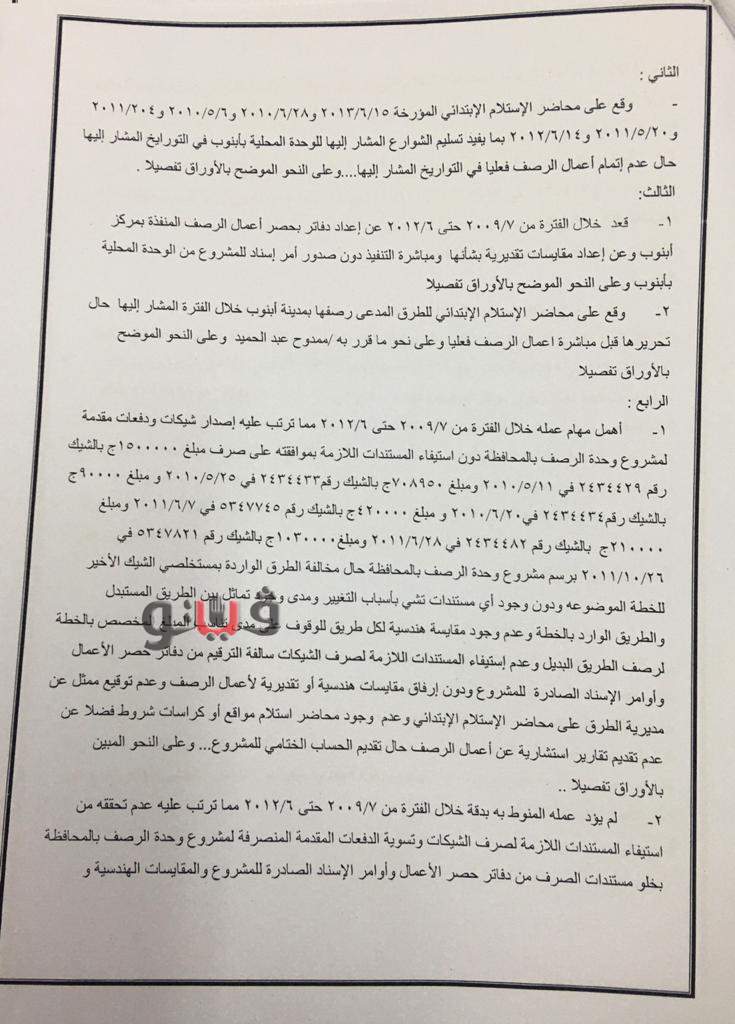وأهمل عمر نادي حسن، مدير حسابات الوحدة المحلية لمركز ومدينة أبنوب في عمله مما ترتب عليه إصدار شيكات ودفعات مقدمة لمشروع وحدة الرصف بالمحافظة دون استيفاء المستندات اللازمة بموافقته على صرف مبالغ مالية بلغت جملتها أربعة ملايين جنيه تقريبًا رغم عدم وجود تماثل بين الطريق المستبدل والطريق الوارد بالخطة أو مقايسة هندسية لكل طريق أو محاضر استلام مواقع أو كراسات شروط للوقوف على مدى تناسب المبلغ المخصص بالخطة لرصف الطريق البديل، ولم يرفق المحال مقايسات هندسية أو تقديرية لأعمال الرصف مع عدم توقيع ممثل عن مديرية الطرق على محاضر الإستلام الإبتدائي