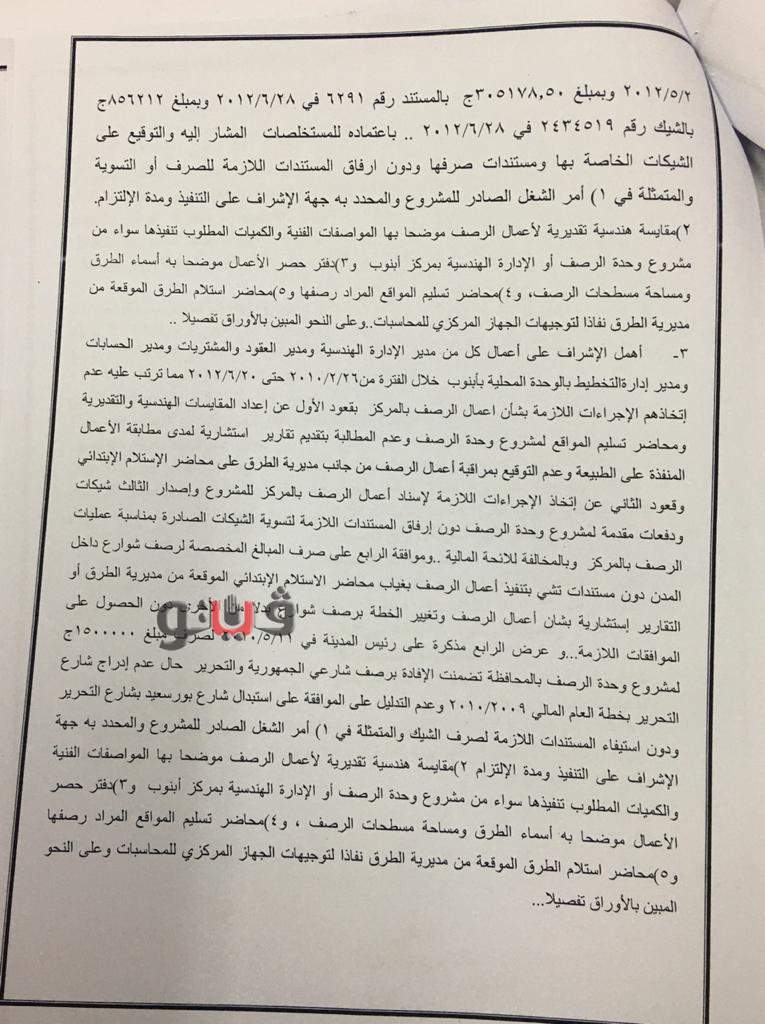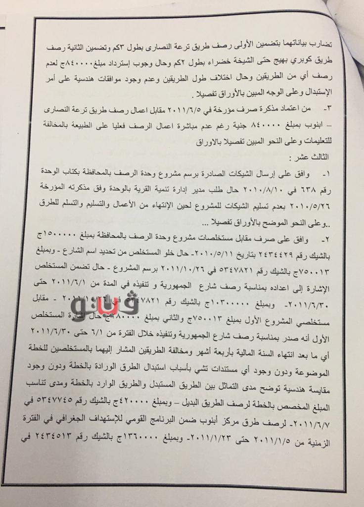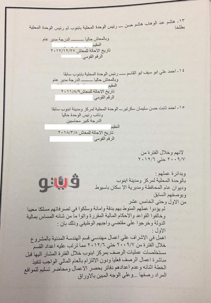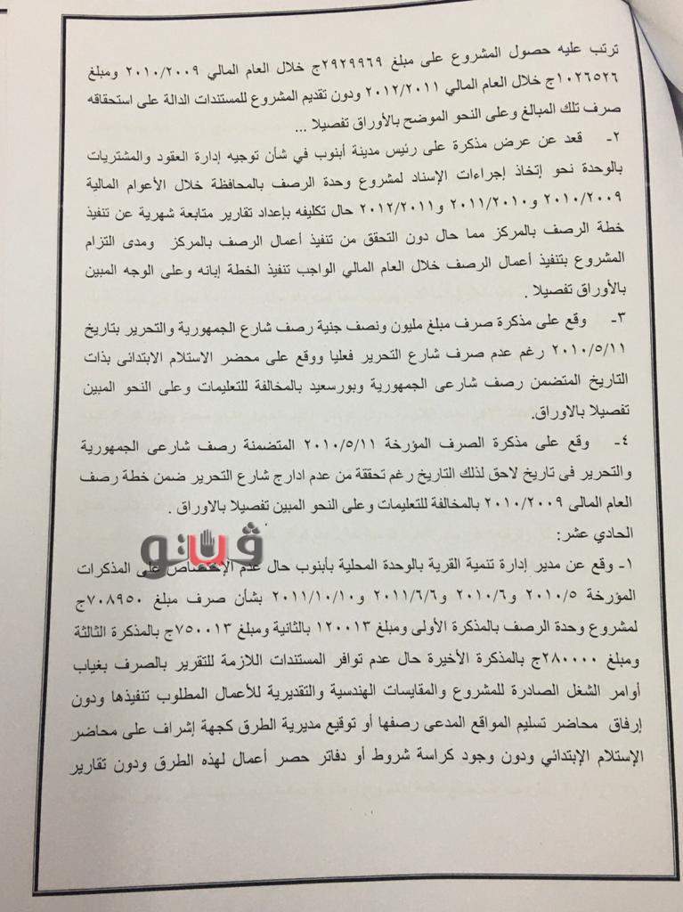 ووافق هاشم عبد الوهاب حسن، رئيس الوحدة المحلية بأبنوب على إرسال الشيكات الخاصة بالرصف ومقابل المستخلصات وقيمتها 12.5 مليون جنيه رغم علمه بعدم تسليمها الا بعد الإنتهاء الفعلي من أعمال الرصف، وأهمل أحمد علي أبو يوسف، رئيس الوحدة المحلية بأبنوب في أداء أعمال وظيفته مما ترتب عليه حدوث مخالفات الرصف، ووقع أحمد ثابت حسن، نائب رئيس الوحدة المحلية بأبنوب كتوقيع أول على شيكات الرصف رغم عدم التنفيذ الفعلي وعدم استيفاء مستندات الرصف.
