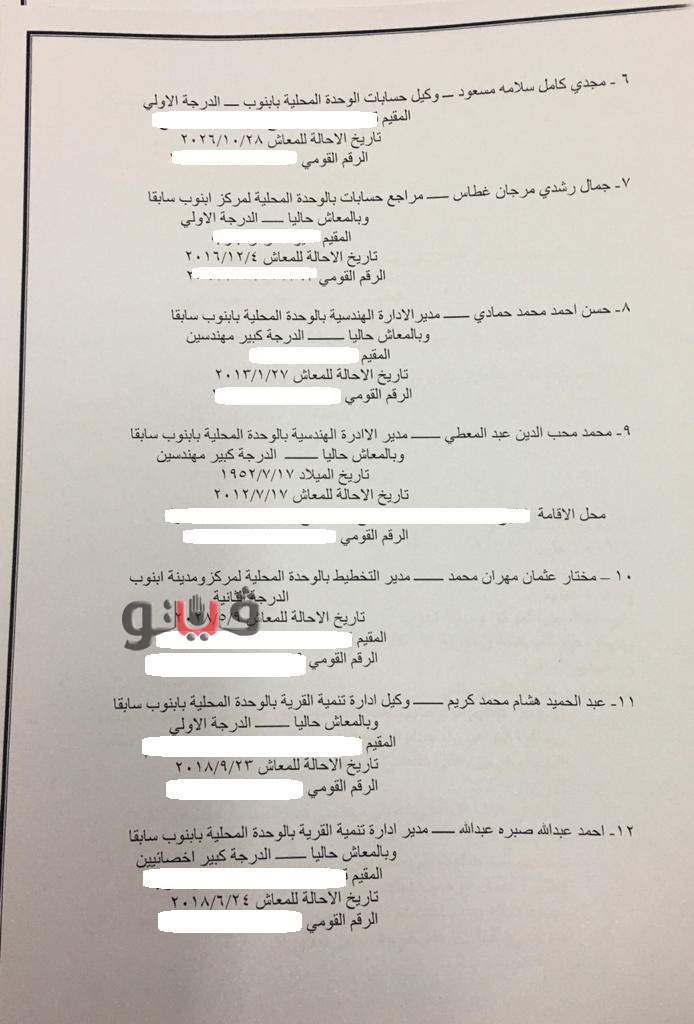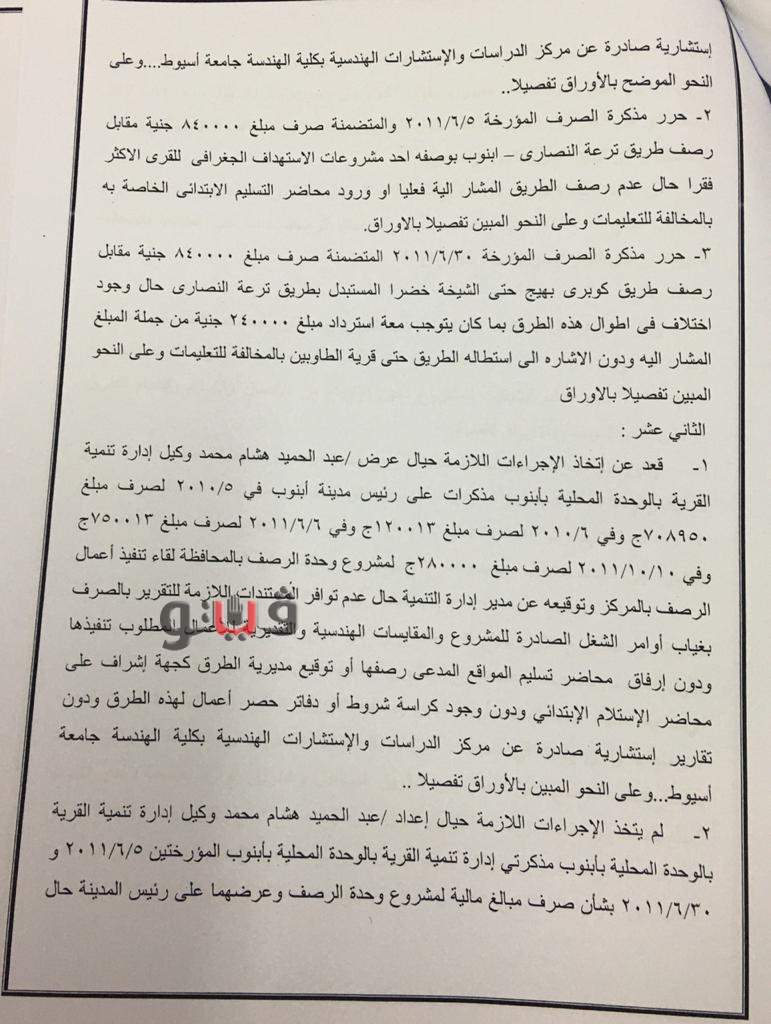 ووقع عبد الحميد هشام محمد، وكيل إدارة تنمية القرية بالوحدة المحلية لمركز ومدينة أبنوب عن مدير ادارة تنمية القرية بالوحدة المحلية بأبنوب رغم عدم اختصاصه على مذكرات صرف 1.8 مليون جنيه رغم عدم وجود ثمة مستندات لاتمام الصرف، وحرر مذكرة تضمنت صرف 840 الف جنيه لرصف طريق ترعة النصارى بأبنوب بوصفه أحد مشروعات الإستهداف الجغرافي للقرى الأكثر فقرًا رغم عدم رصفه، وحرر مذكرة صرف اخرى بمبلغ 840 الف جنيه لرصف طريق كوبري بهيج رغم وجود اختلاف أطوال بالطرق تستوجب استرداد 240 الف جنيه.