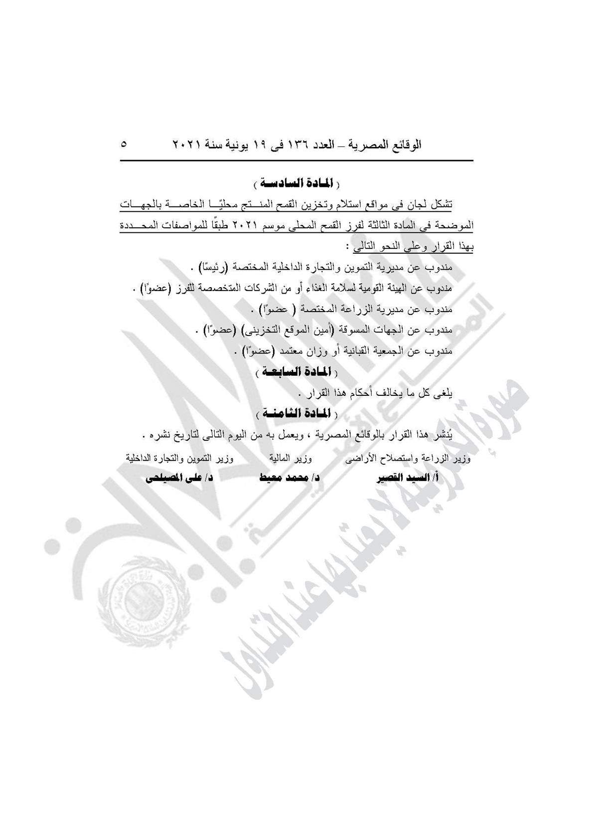 وجاء في المادة الأولى للقرار "يتم توريد محصول القمح محليًا موسم 2021، لحساب الهيئة العامة للسلع التموينية اختياريًا على أن يبدأ موسم التوريد اعتبارًا من 15/4/2021 وحتى 15/7/2021".