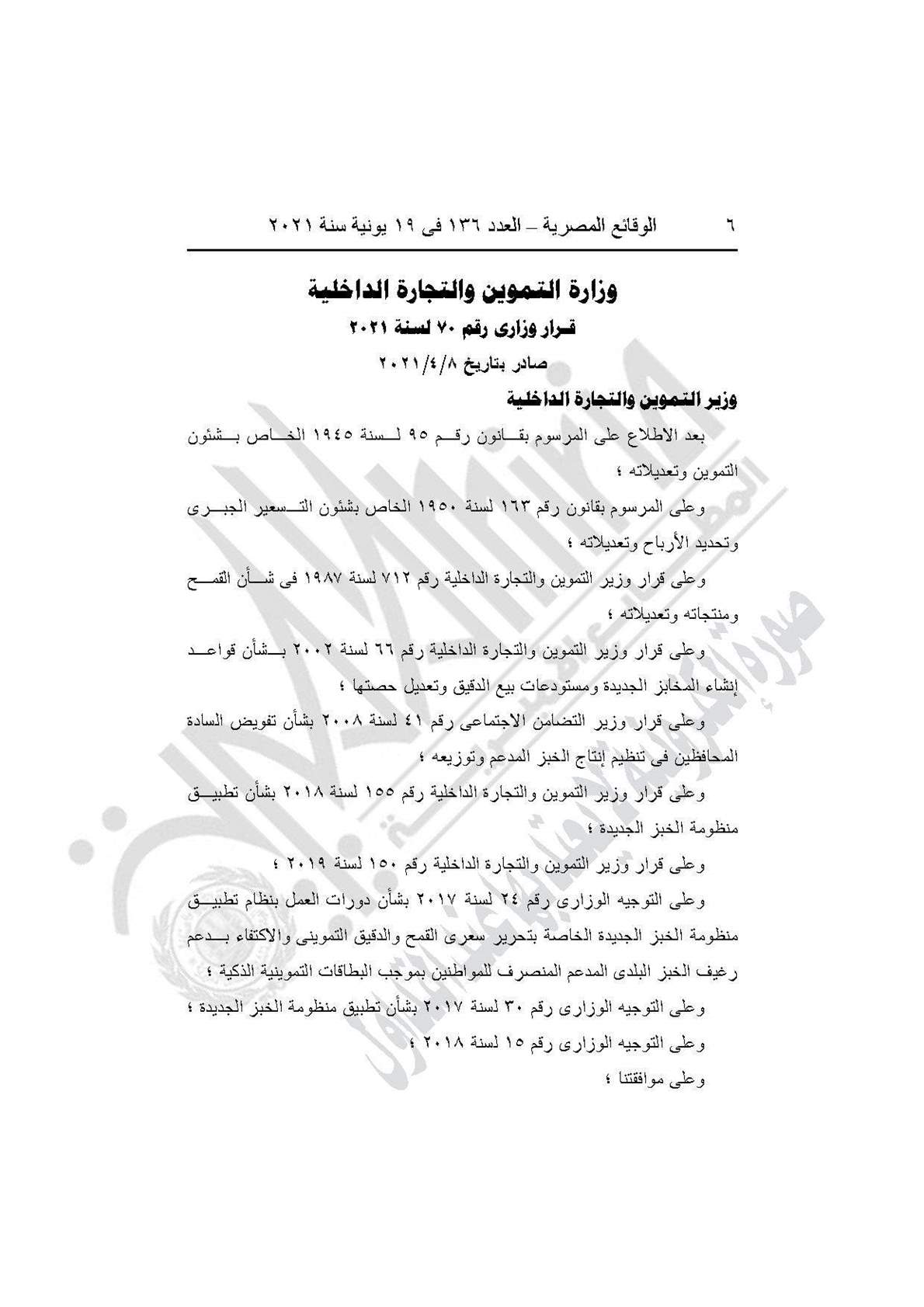 نشرت جريدة الوقائع المصرية في عددها رقم 136، الصادر في 19 يونية 2021، قرار وزارة التموين والتجارة الداخلية رقم 70 لسنة 2021، بشأن مراعاة ترتيب الطلبات المقدمة طبقًا لأولوية تقديم الطلب لأحد من أقاربه حتى الدرجة الرابعة مخبز أو منفذ مشروع جمعيتي.
