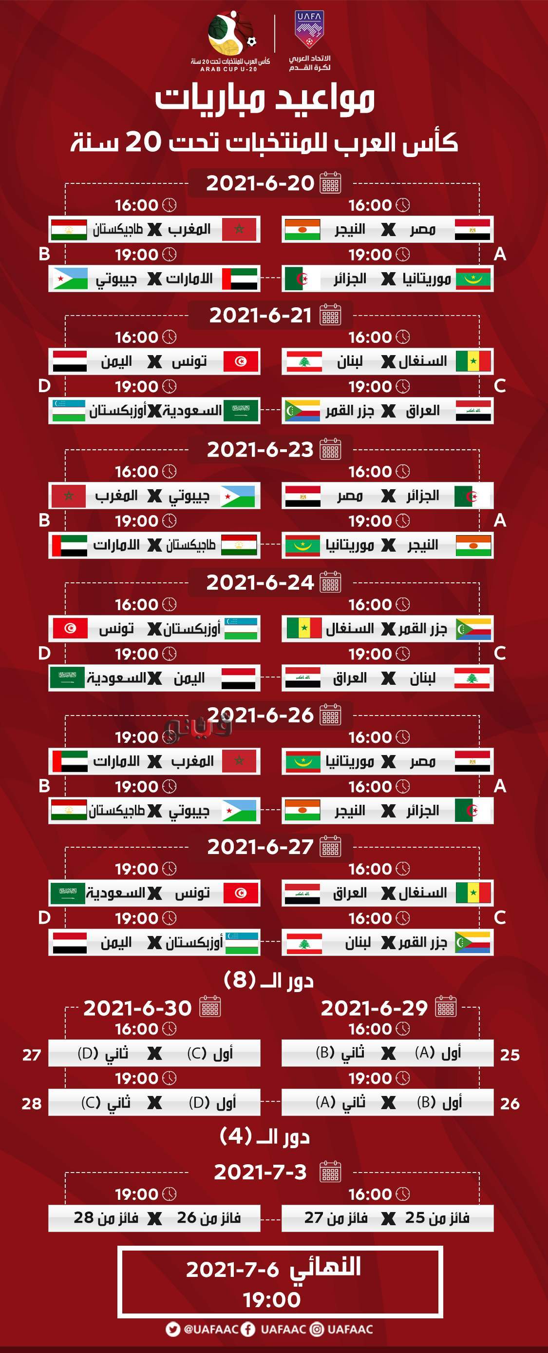 وجاءت مواعيد مباريات بطولة كأس العرب للشباب كالتالي: