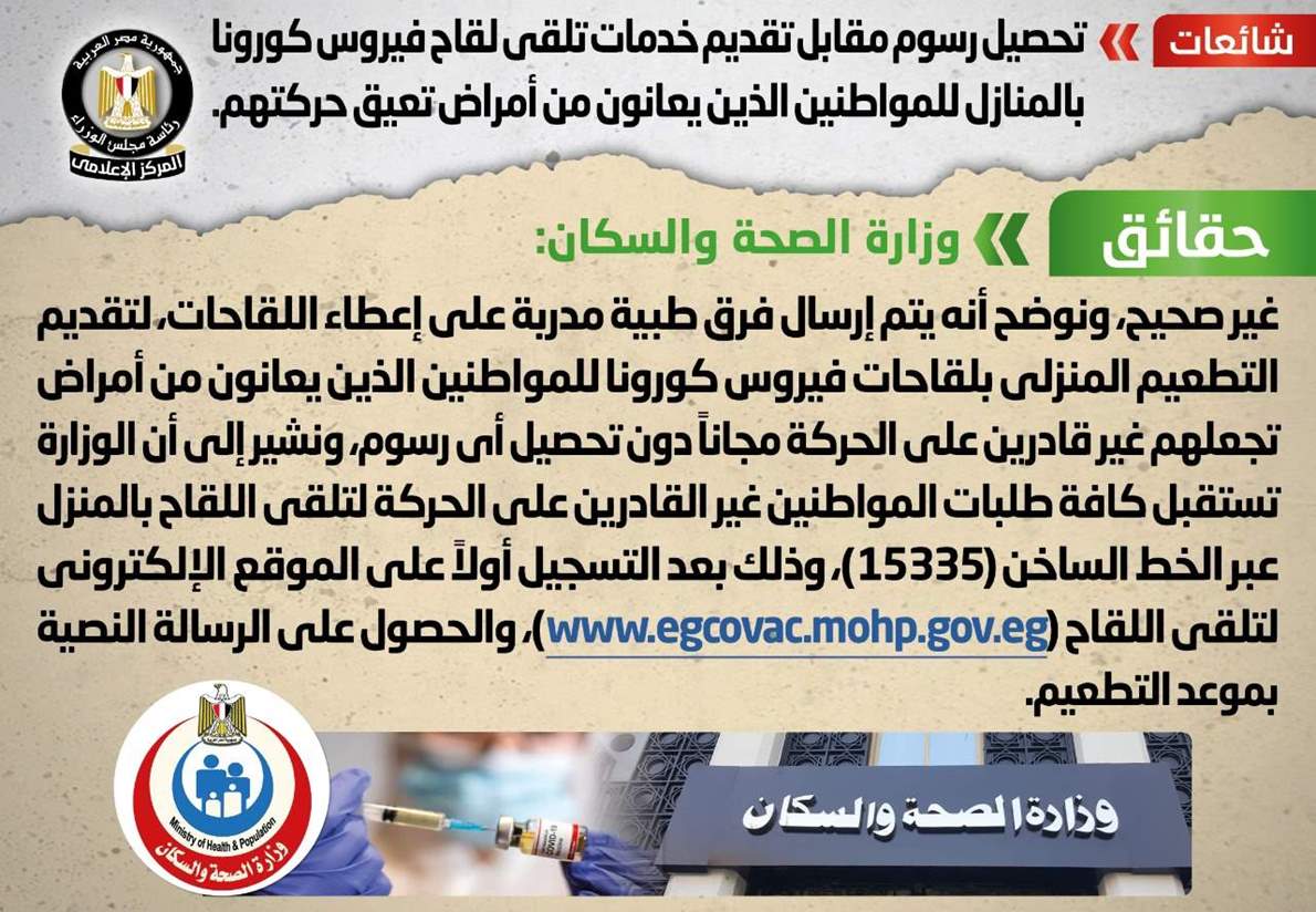 وتواصل المركز الإعلامي لمجلس الوزراء مع وزارة الصحة والسكان، والتي نفت تلك الأنباء، مُؤكدةً أنه لا صحة لتحصيل رسوم مقابل تقديم خدمات تلقي لقاح فيروس كورونا بالمنازل للمواطنين الذين يعانون من أمراض تعيق حركتهم، مُوضحةً أنه يتم إرسال فرق طبية مدربة على إعطاء اللقاحات، لتقديم التطعيم المنزلي بلقاحات فيروس كورونا للمواطنين الذين يعانون من أمراض تجعلهم غير قادرين على الحركة مجاناً دون تحصيل أي رسوم.