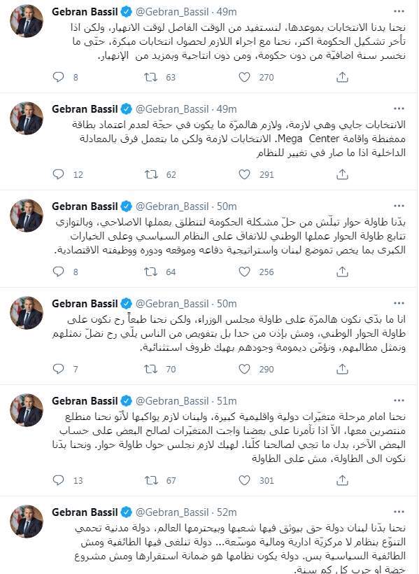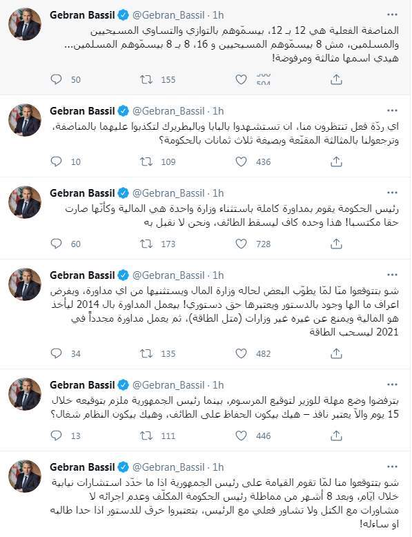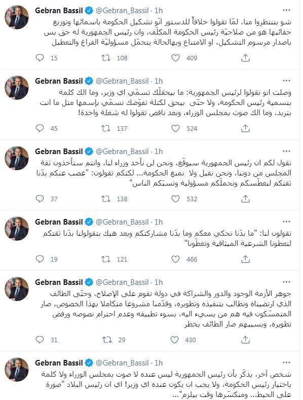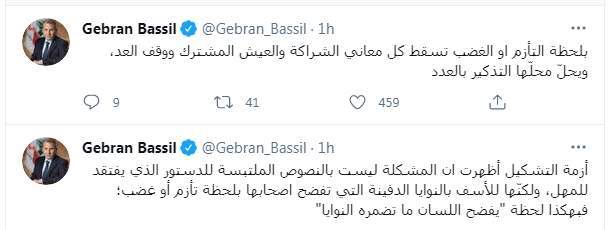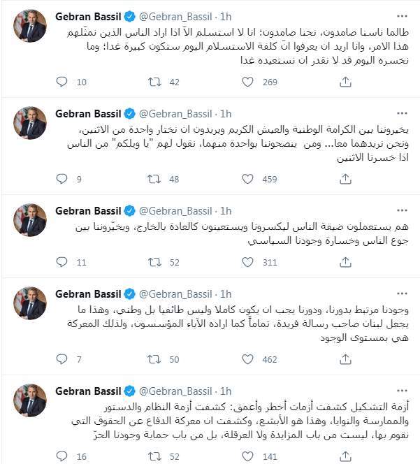 وكتبت جبران باسيل تغريدة على تويتر "أزمة التشكيل كشفت أزمات أخطر وأعمق: كشفت أزمة النظام والدستور والممارسة والنوايا، وهذا هو الأبشع، وكشفت ان معركة الدفاع عن الحقوق التي نقوم بها، ليست من باب المزايدة ولا العرقلة، بل من باب حماية وجودنا الحرّ"