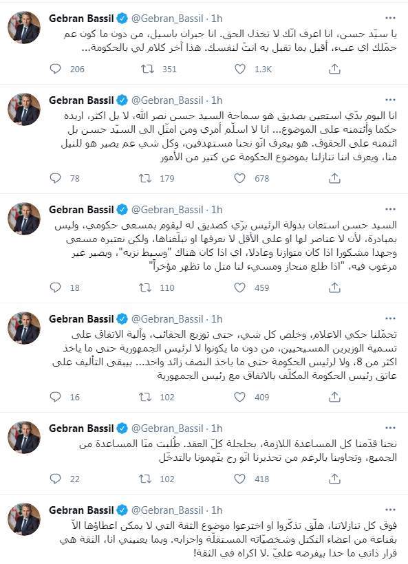 وعلق "يا سيّد حسن، انا اعرف انّك لا تخذل الحق. انا جبران باسيل، من دون ما كون عم حمّلك اي عبء، أقبل بما تقبل به انتَ لنفسك. هذا آخر كلام لي بالحكومة..."