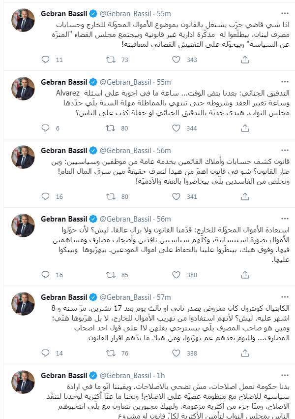 هاجم رئيس التيار الوطني اللبناني جبران باسيل، وزير خارجية لبنان السابق، رئيس الحكومة اللبنانية المُكلف سعد الحريري، في أزمة تشكيل الحكومة اللبنانية، المستمرة من أكتوبر 2020 حتى اللآن، كما هاجم سمير جعجع.