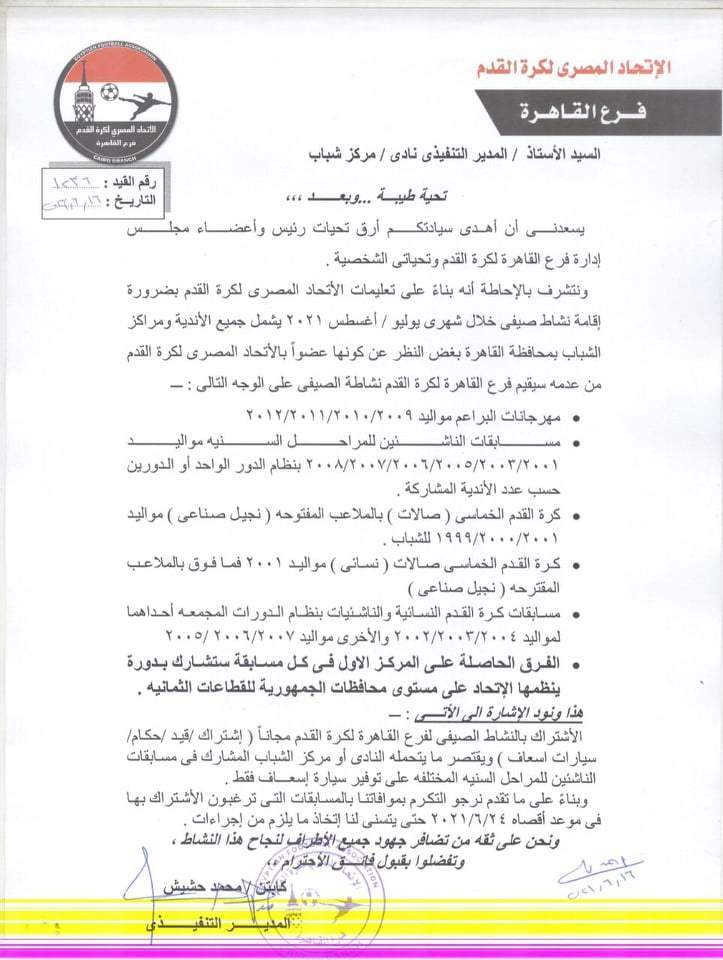 وأرسلت منطقة القاهرة خطابات للأندية ومراكز الشباب التابعة للفرع بتفاصيل النشاط الرياضي بعد إعتماده محمد حشيش المدير التنفيذي لمنطقة القاهرة وأيمن حسان مدير إدارة المسابقات بالمنطقة .