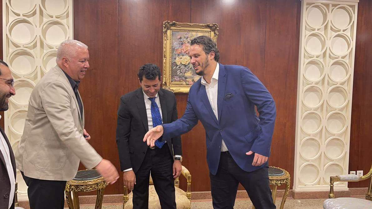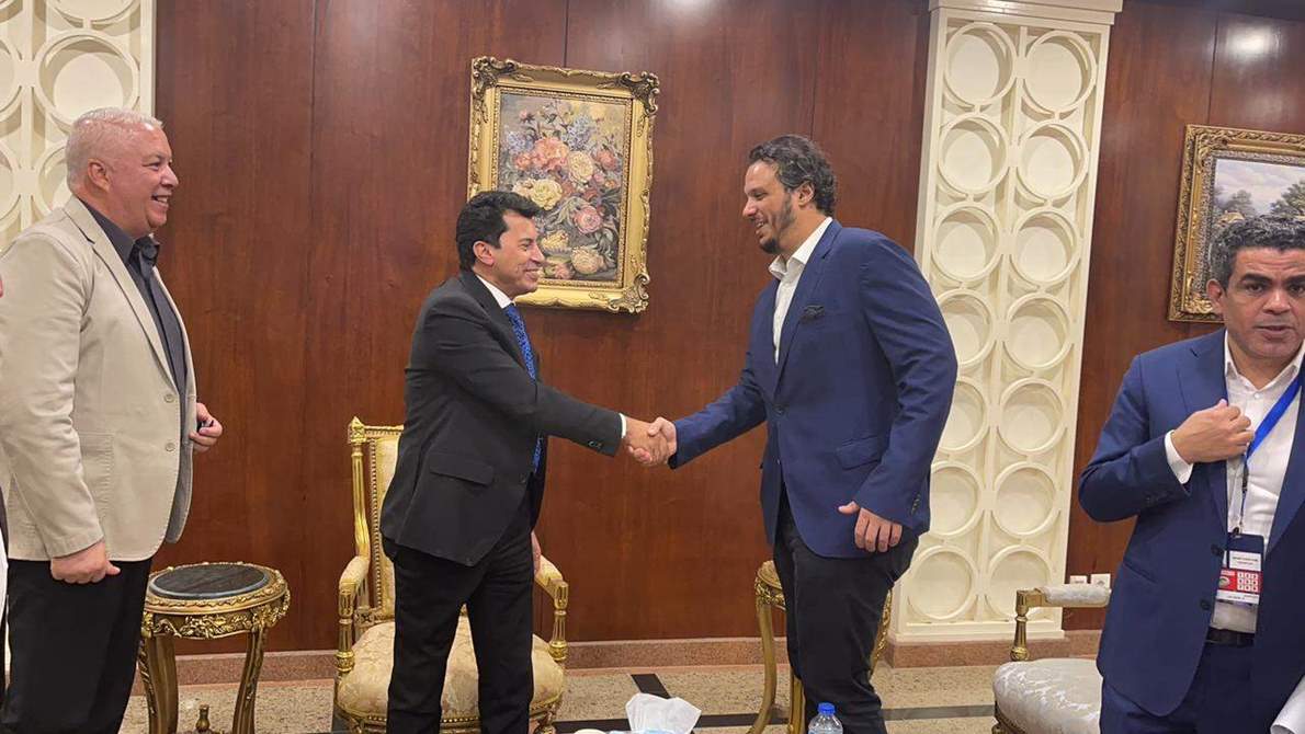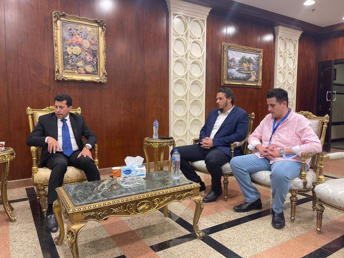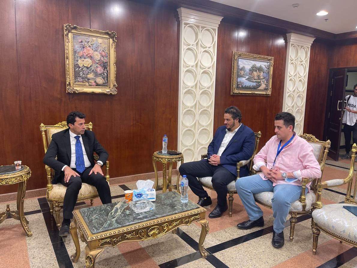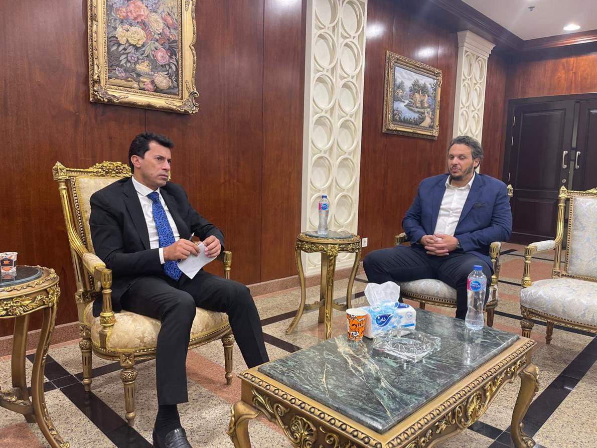 استقبل ممدوح عيد الرئيس التنفيذي لنادي بيراميدز الدكتور أشرف صبحي وزير الشباب والرياضة، الذي حرص على دعم بيراميدز في مباراته أمام الرجاء المغربي.