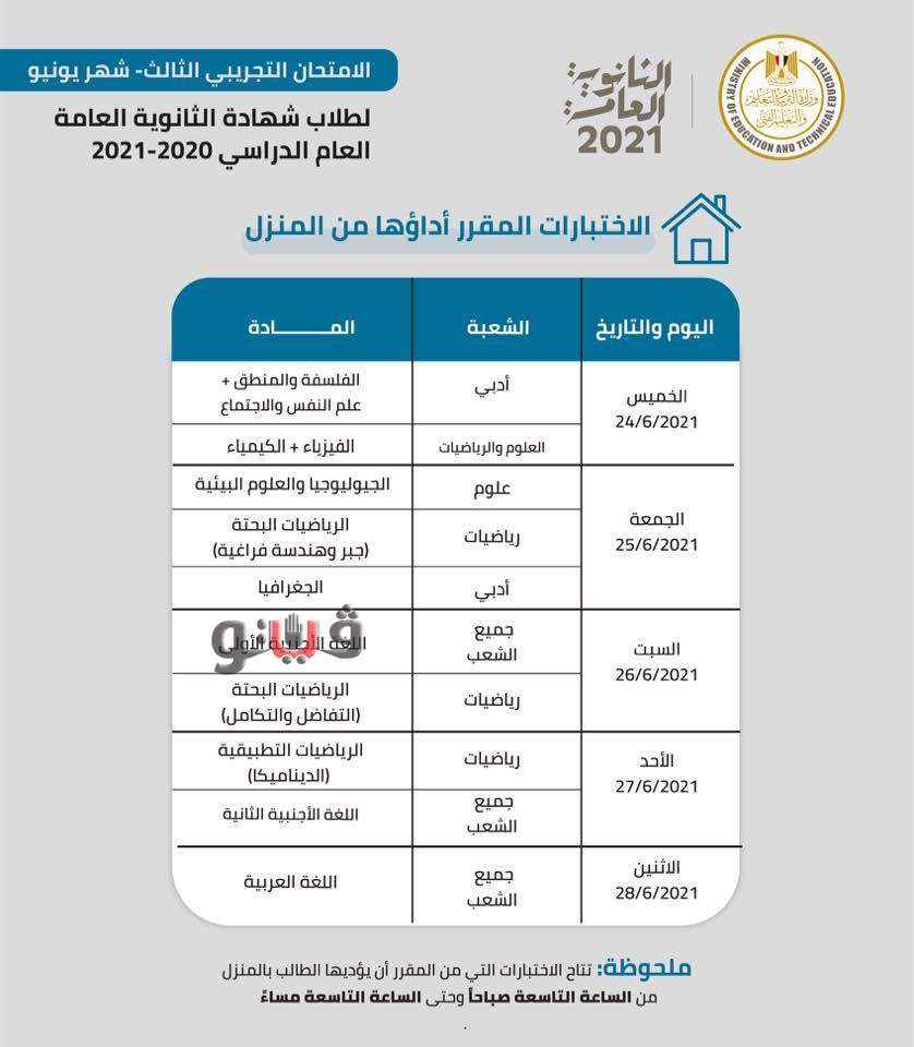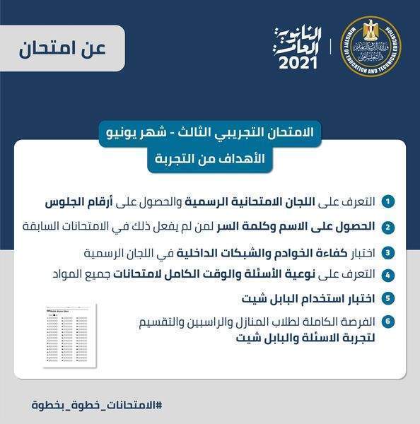 ويعقد الامتحان التجريبي الثالث لطلاب الثانوية العامة في الفترة من (اليوم الإثنين 21/6/2021 وحتى الإثنين 28/6/2021).