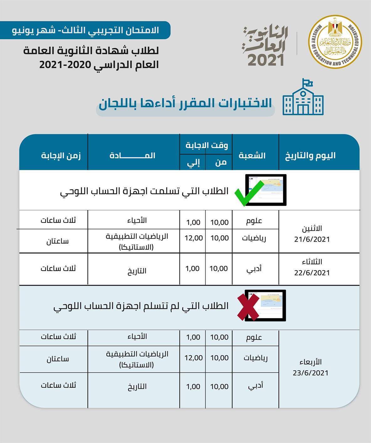 - يحضر الطلاب (الذين تسلموا جهاز التابلت) الامتحان داخل اللجنة المدرسية أحد أيام (الإثنين 21/6/2021 "للشعبة العلمية"، أو الثلاثاء 22/6/2021 "للشعبة الأدبية").