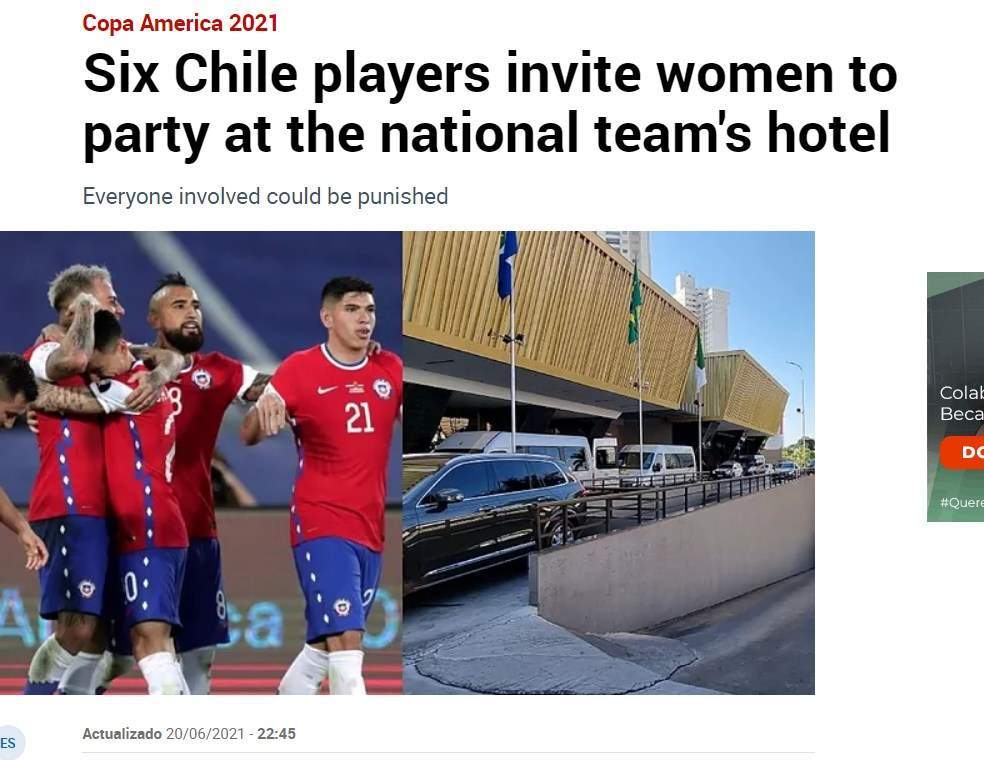 كشفت صحيفة ماركا الإسبانية استنادًا إلى مصادر صحفية تشيلية، أن 5 لاعبين من تشيلي على الأقل دعوا العديد من نساء فتيات الليل للانضمام إليهم في فندق Gran Hotel Odara حيث يقيم الفريق خلال بطولة كوبا أمريكا التي تقام في البرازيل.