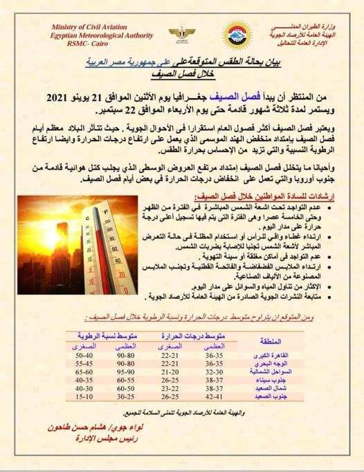 أكدت هيئة الأرصاد الجوية على ضرورة استخدام أغطية للرأس، وعدم التواجد تحت أشعة الشمس المباشرة في الفترة من الواحدة ظهرًا حتى الخامسة عصرًا.