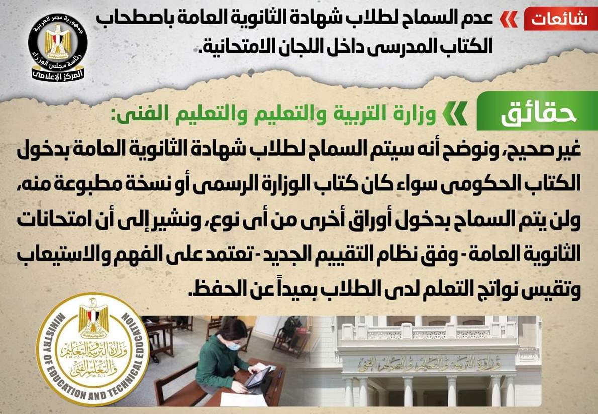 وتواصل المركز الإعلامي لمجلس الوزراء مع وزارة التربية والتعليم والتعليم الفني، والتي نفت تلك الأنباء، مُؤكدةً أنه لا صحة لعدم السماح لطلاب شهادة الثانوية العامة باصطحاب الكتاب المدرسي داخل اللجان الامتحانية.