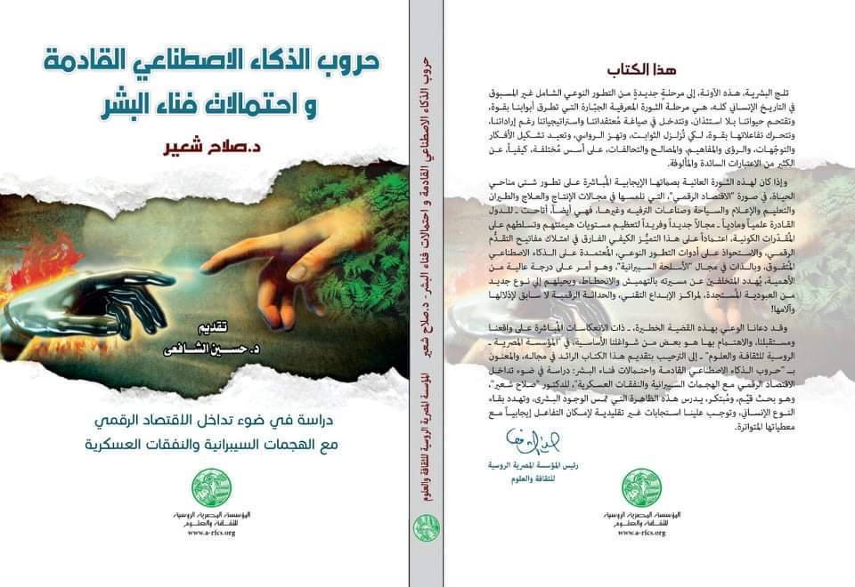 صدر حديثا عن "المؤسسة المصرية الروسية للثقافة والعلوم" كتاب جديد، وذلك تحت عنوان "حروب الذكاء الاصطناعي القادمة واحتمالات فناء البشر"، وهي دراسة في ضوء تداخل الاقتصاد الرقمي مع الهجمات السيبرانية والنفقات العسكرية.