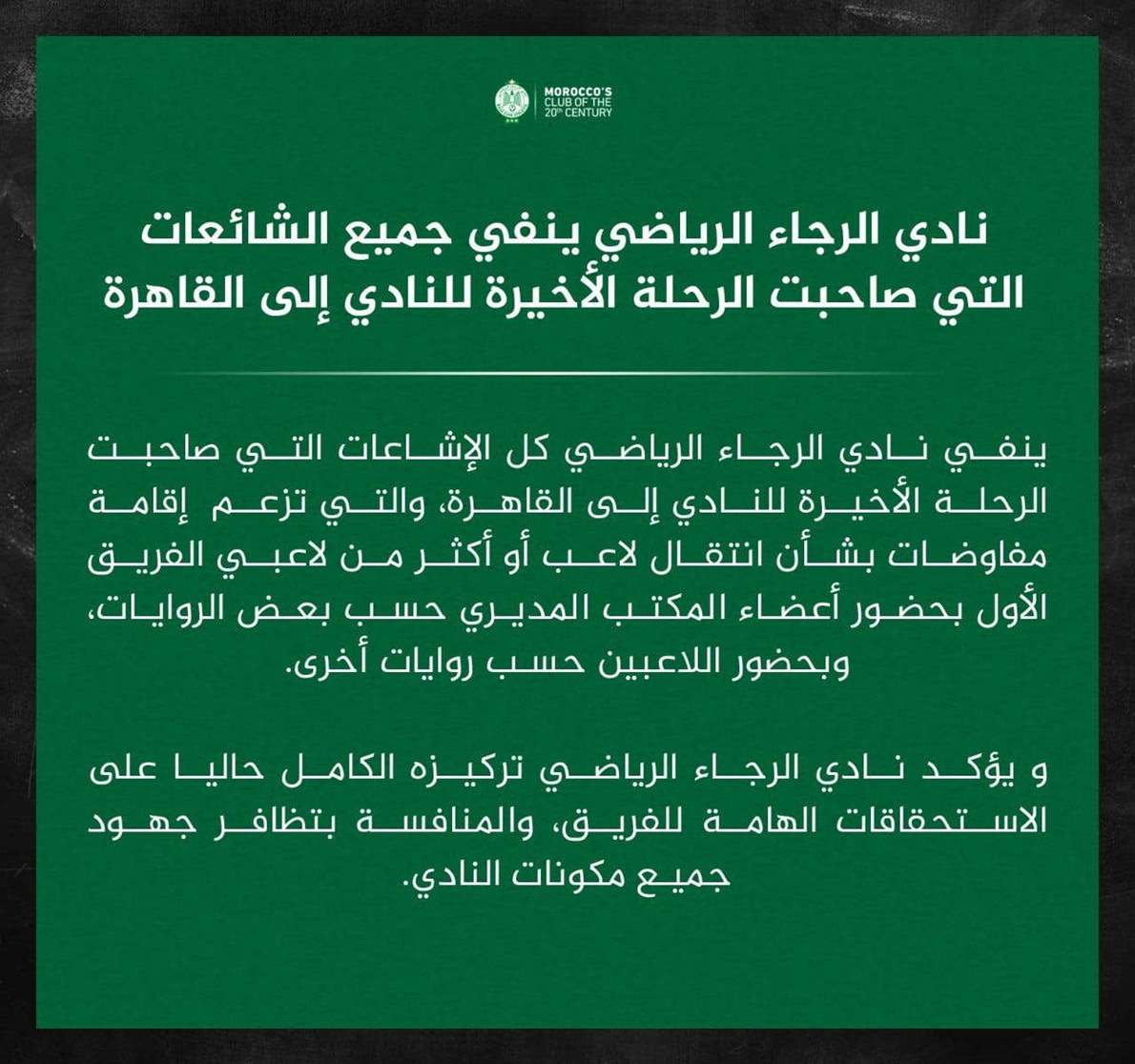 وأضاف نادي الرجاء في بيان رسمي صادر عنه اليوم الإثنين، أنه ينفي كل الإشاعات التي صاحبت الرحلة الأخيرة للنادي إلى القاهرة، والتي تزعم إقامة مفاوضات بشأن انتقال لاعب أو أكثر من لاعبي الفريق الأول بحضور أعضاء المكتب المديري حسب بعض الروايات وبحضور اللاعبين حسب روايات أخرى.
