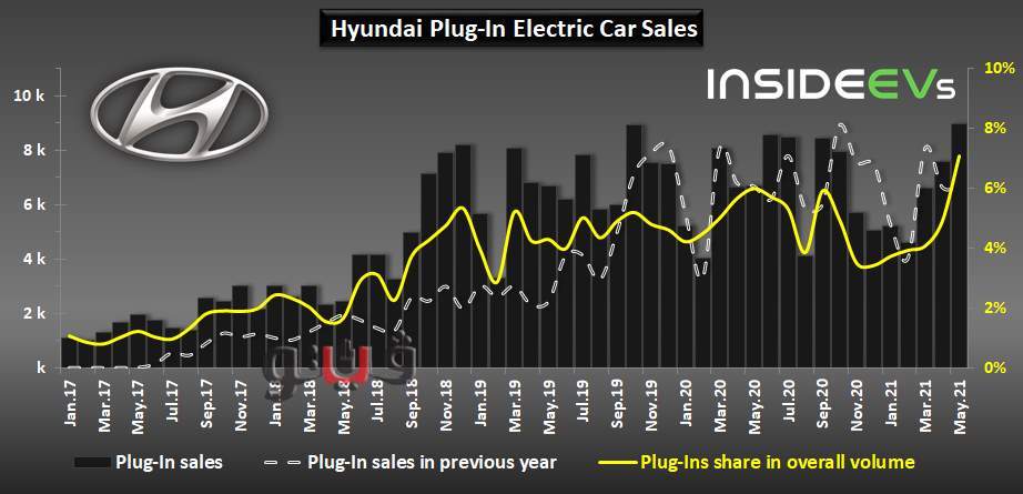 بلغت مبيعات هيونداي من السيارات الهجينة 8,977 سيارة فى شهر مايو وهو ما يزيد بنسبة 34٪ عن العام الماضي و 7.1٪ من الحجم الإجمالي للعلامة التجارية، حيث حققت مبيعات 8924 سيارة في أكتوبر 2019.