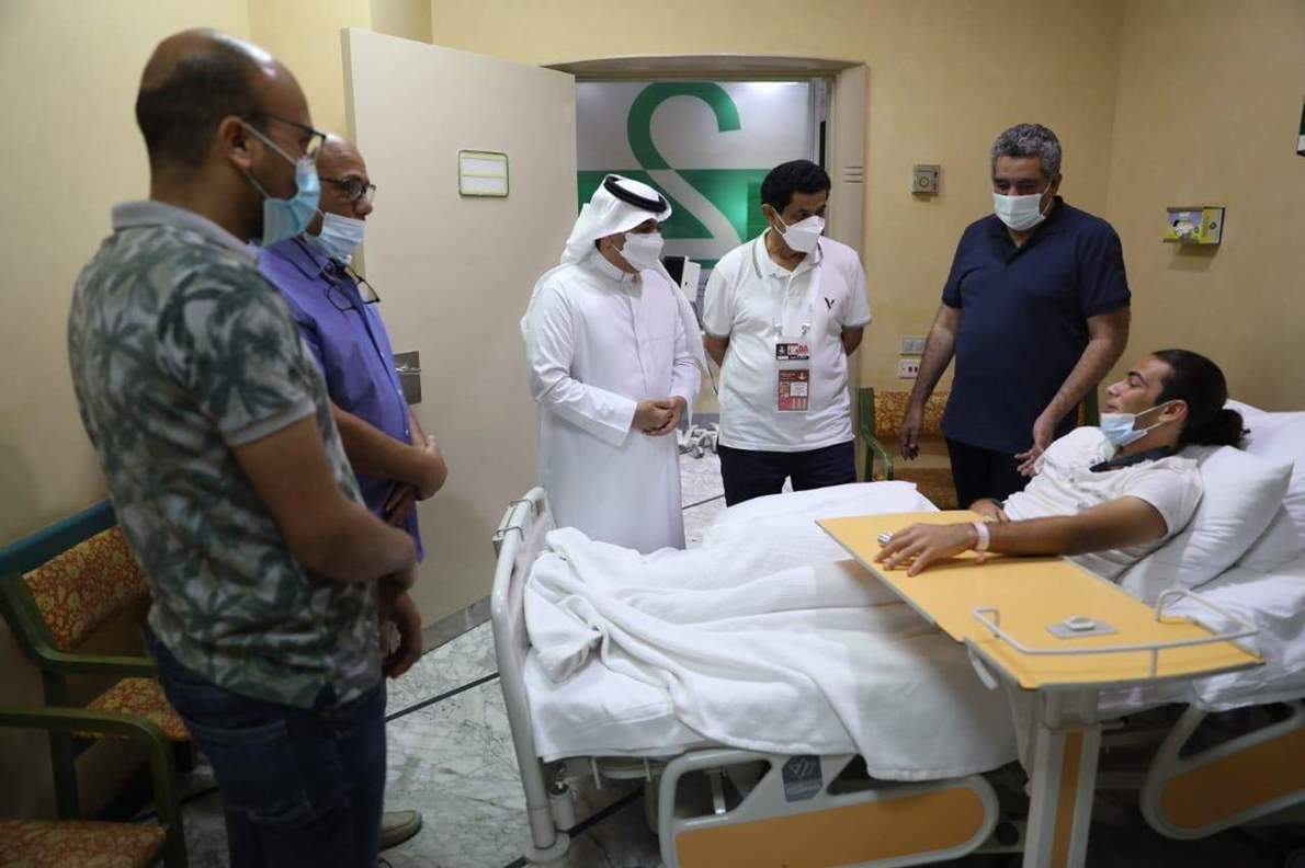 الأمين العام للاتحاد العربي لكرة القدم يطمئن على لاعب منتخب مصر