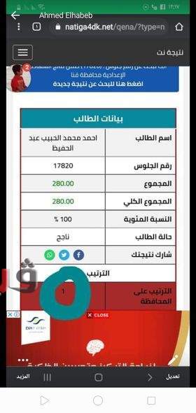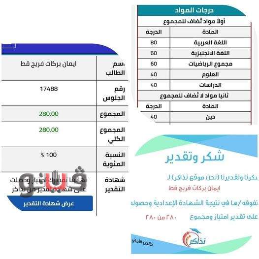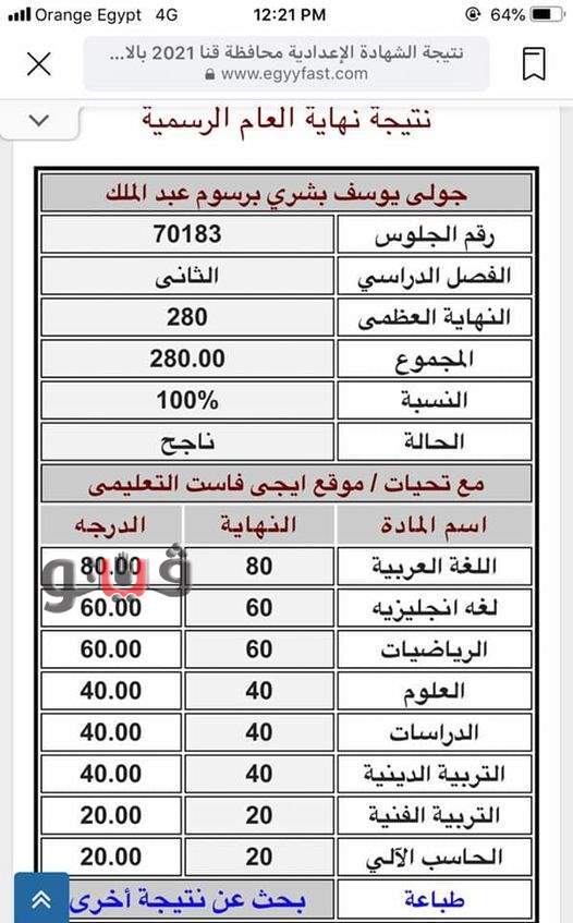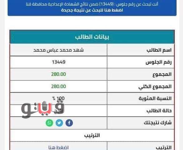 محافظ قنا واعتمد اللواء أشرف الداودي، محافظ قنا، نتيجة الشهادة الإعدادية بنسبة نجاح بلغت 83.57 %، وذلك في حضور الدكتور صبري خالد وكيل وزارة التربية والتعليم.