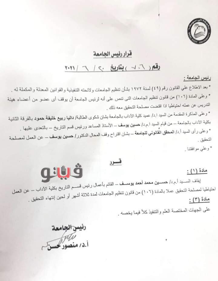 رئيس جامعة بني سويف وفور إبلاغ الدكتور منصور حسن رئيس الجامعة بالواقعة، أمر سيادته بإجراء تحقيق عاجل وبناءً عليه أصدر قرارًا ـ طبقًا لنص القانون ـ بإيقاف عضو هيئة التدريس المُعتدى عن العمل لمدة ثلاثة أشهر لحين انتهاء التحقيقات، معبرًا عن استيائه الشديد واستنكاره لهذا التصرف المشين الصادر من عضو هيئة تدريس ينتمي إلى جامعة بني سويف، لمخالفته القيم والأعراف والتقاليد الجامعية وما تدعو له الأديان السماوية وكافة قواعد الأخلاق والإنسانية.