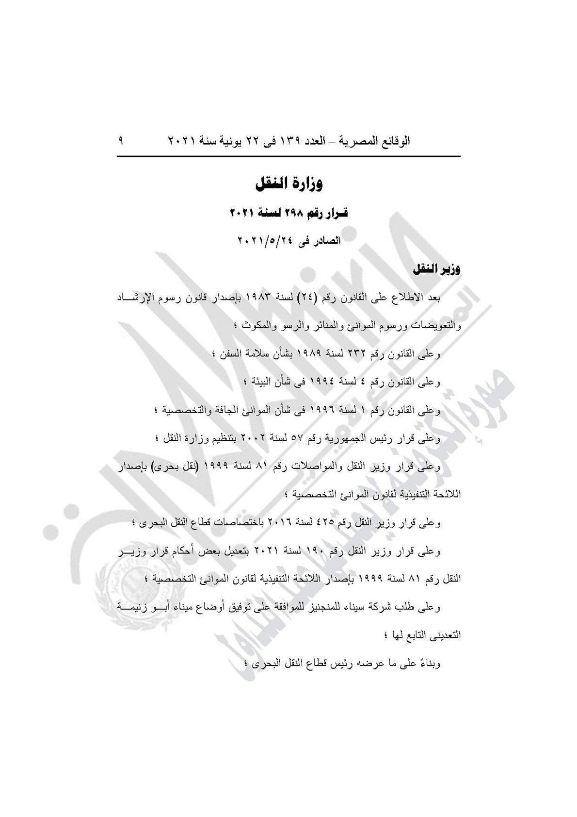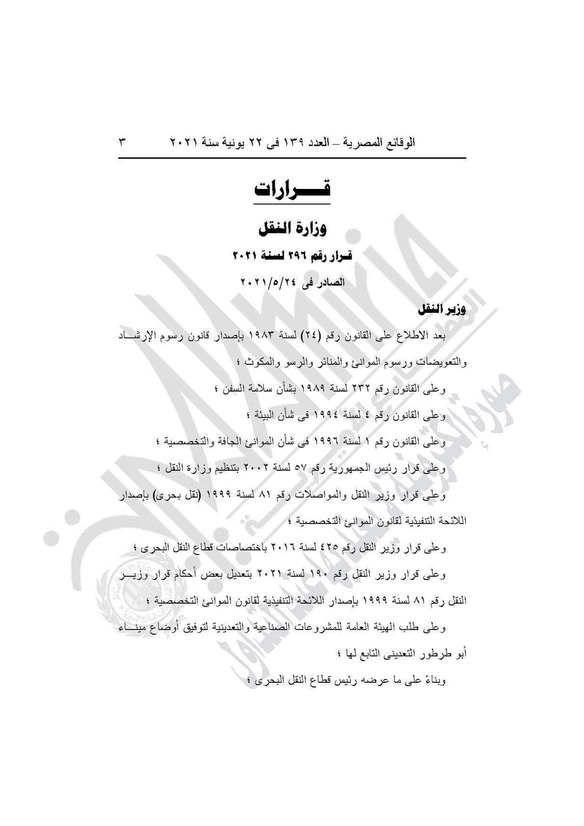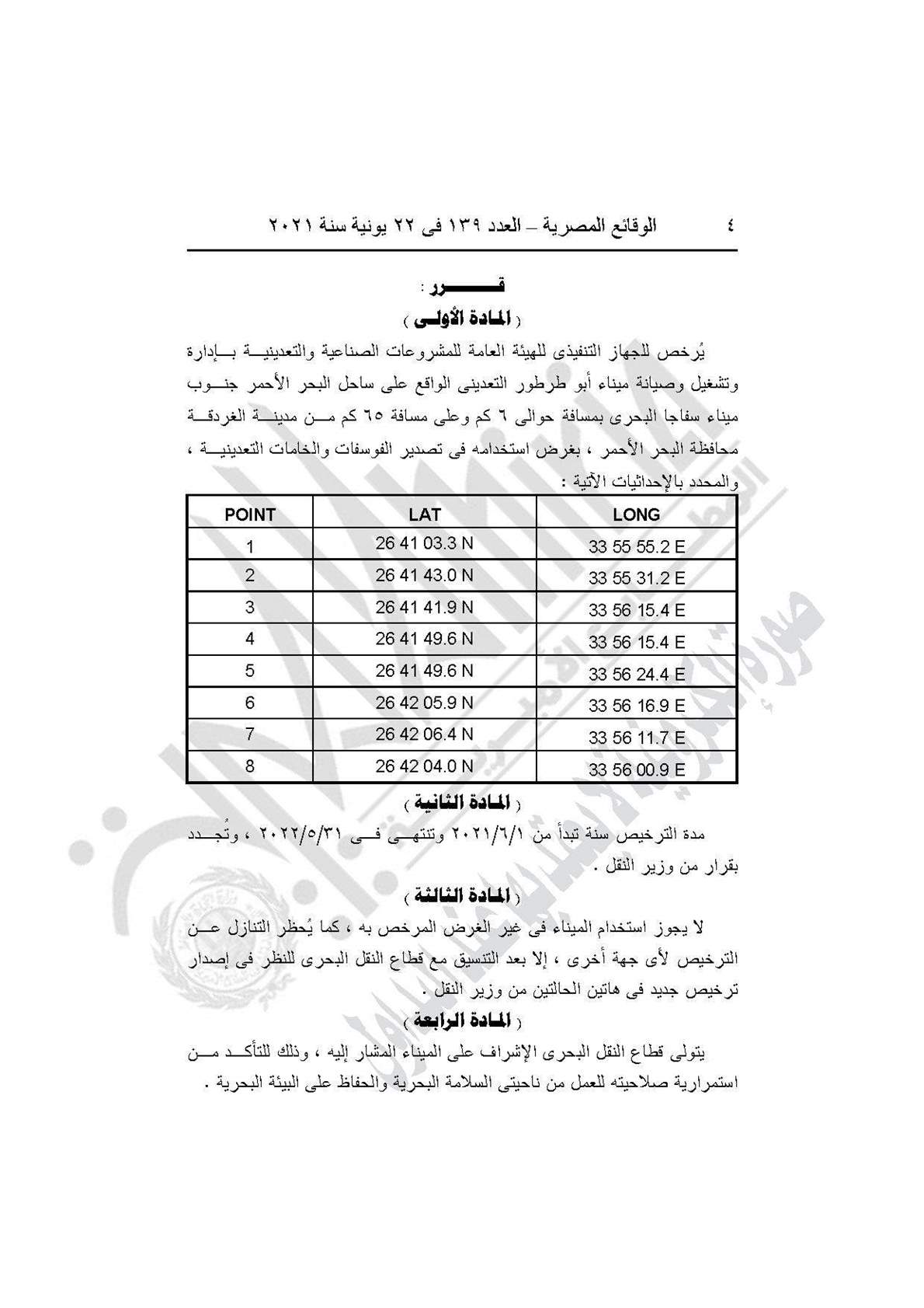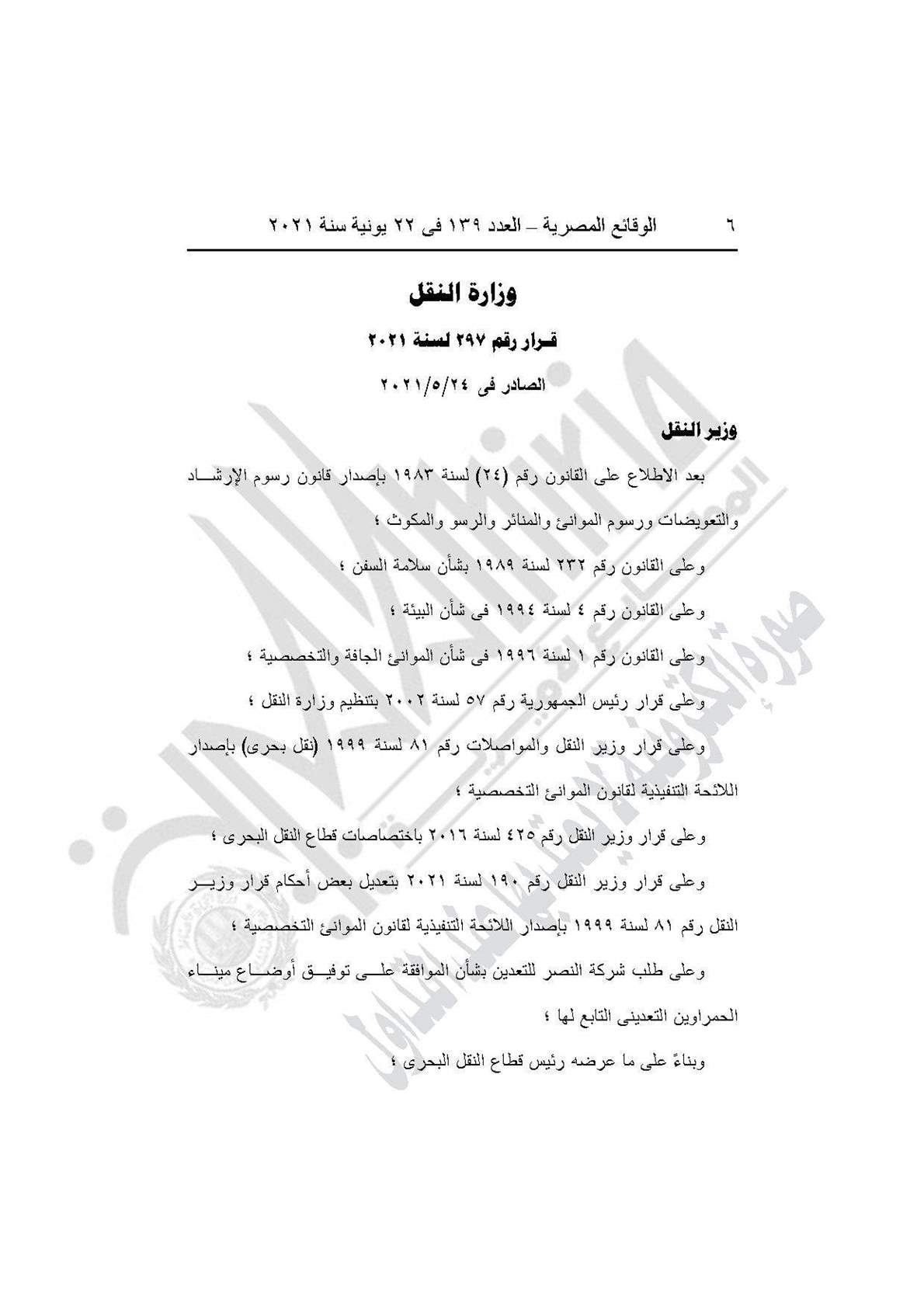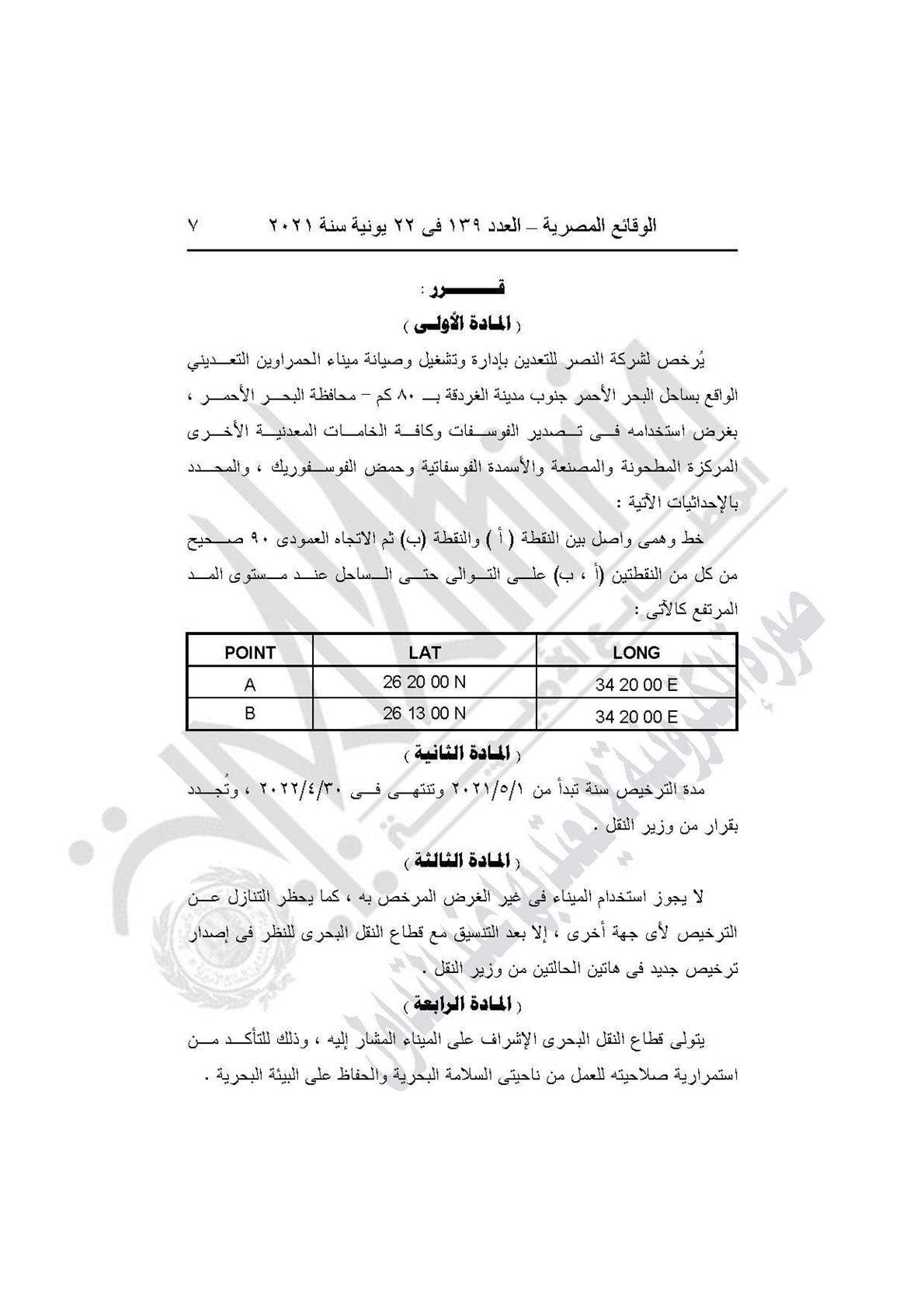 والقرار رقم 297 لسنة 2021، بشأن الترخيص لشركة النصر للتعدين بإدارة وتشغيل وصيانة ميناء الحمراوين التعديني الواقع بساحل البحر الأحمر جنوب مدينة الغردقة بـ 80 كيلو مترًا بمحافظة البحر الأحمر، بغرض استخدامه فى تصدير الفوسفات وكافة الخامات المعدنية الأخرى المركزة المطحونة والمصنعة والأسمدة الفوسفاتية وحمض الفوسفوريك.