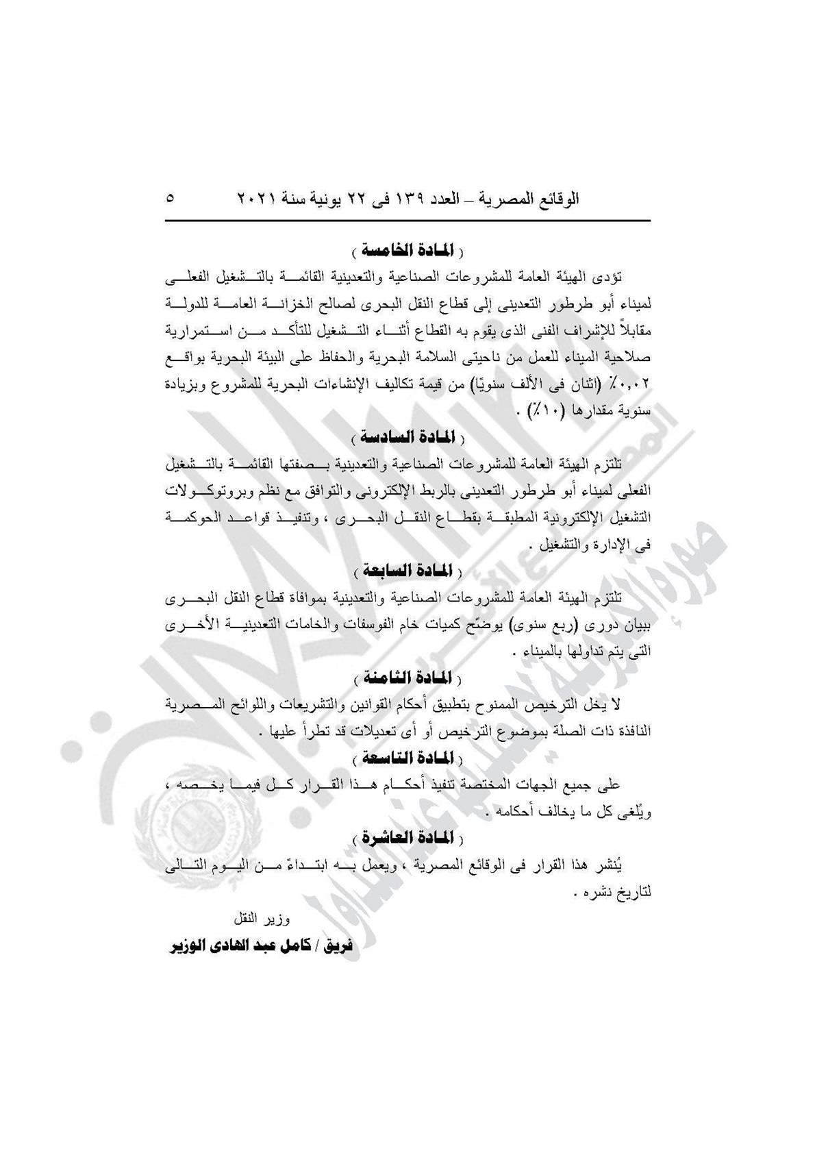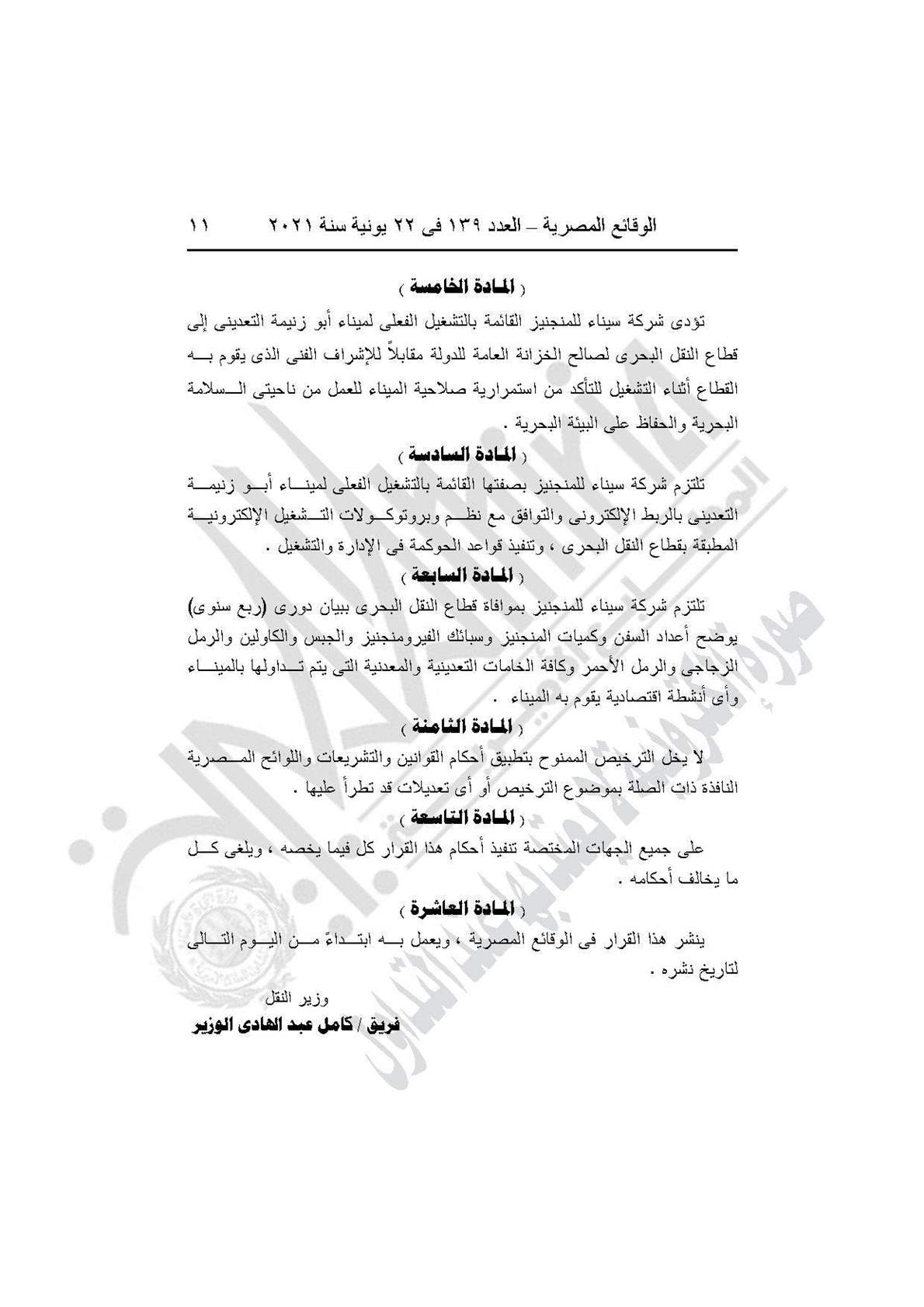 نشرت جريدة الوقائع المصرية في عددها رقم 139، الصادر في 22 يونية 2021، 3 قرارات لوزارة النقل بشأن الترخيص للجهاز التنفيذى للهيئة العامة للمشروعات الصناعية والتعدينية، ولشركة النصر للتعدين بإدارة وتشغيل وصيانة ميناء الحمراوين التعديني بالبحر الأحمر، ولشركة سيناء للمنجنيز بإدارة وتشغيل وصيانة ميناء أبو زنيمة التعدينى بجنوب سيناء.