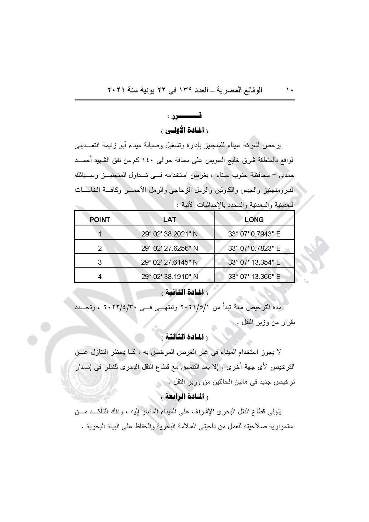 والقرار رقم 298 لسنة 2021، الترخيص لشركة سيناء للمنجنيز بإدارة وتشغيل وصيانة ميناء أبو زنيمة التعدينى الواقع بالمنطقة شرق خليج السويس على مسافة حوالى 140 كم من نفق الشهيد أحمد حمدى بمحافظة جنوب سيناء، بغرض استخدامه فى تداول المنجنيز وسبائك الفيرومنجنيز والجبس والكاولين والرمل الزجاجى والرمل الأحمر وكافة الخامات التعدينية والمعدنية.