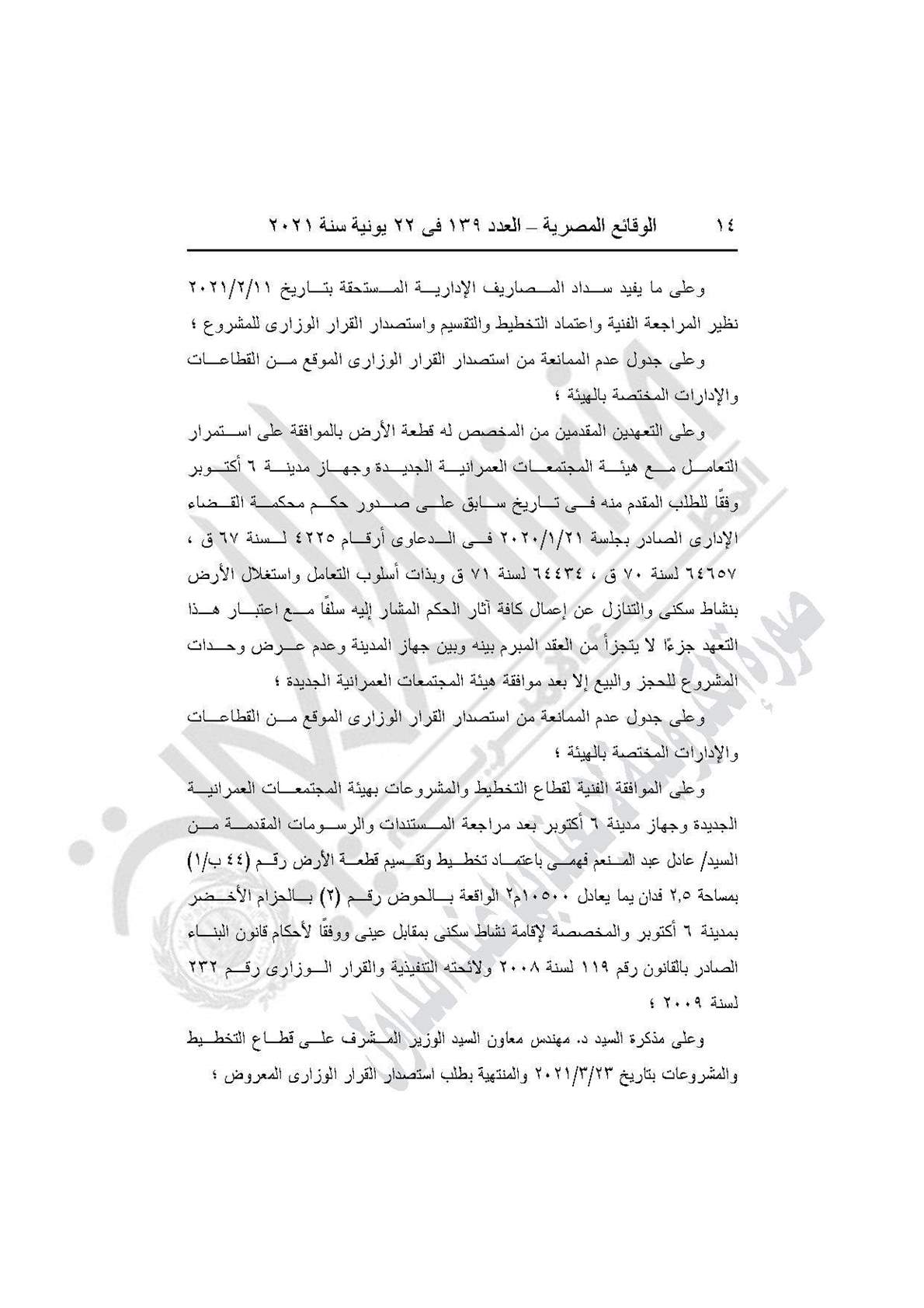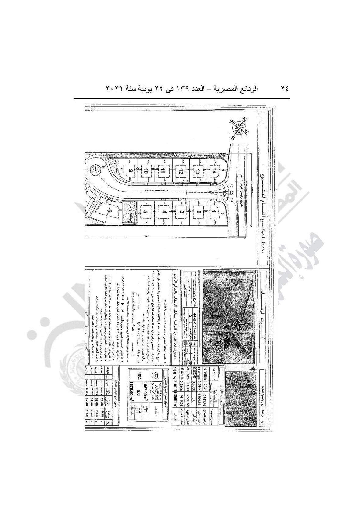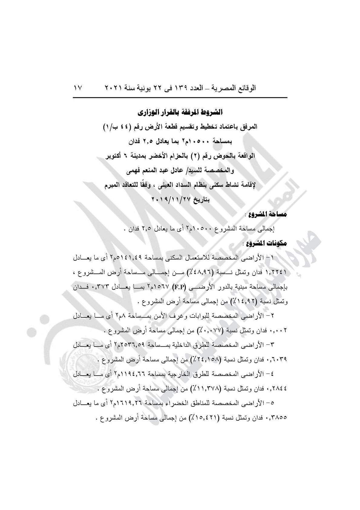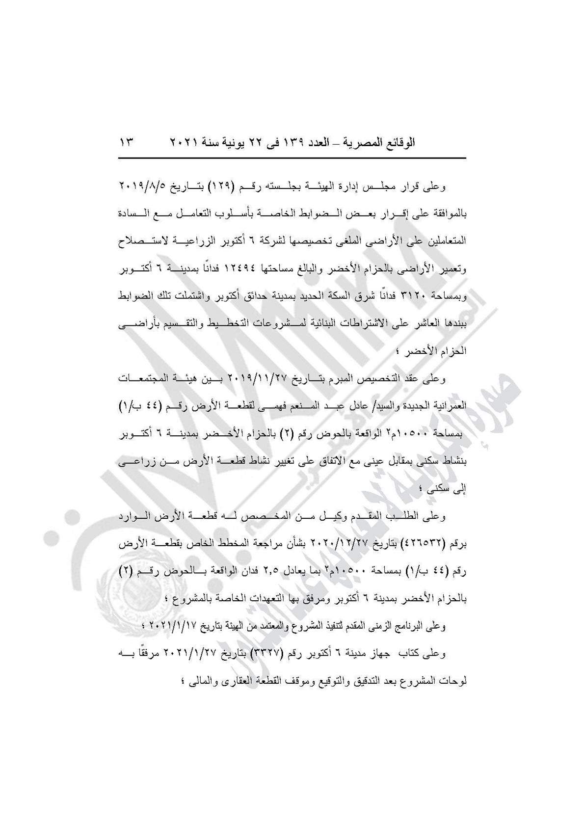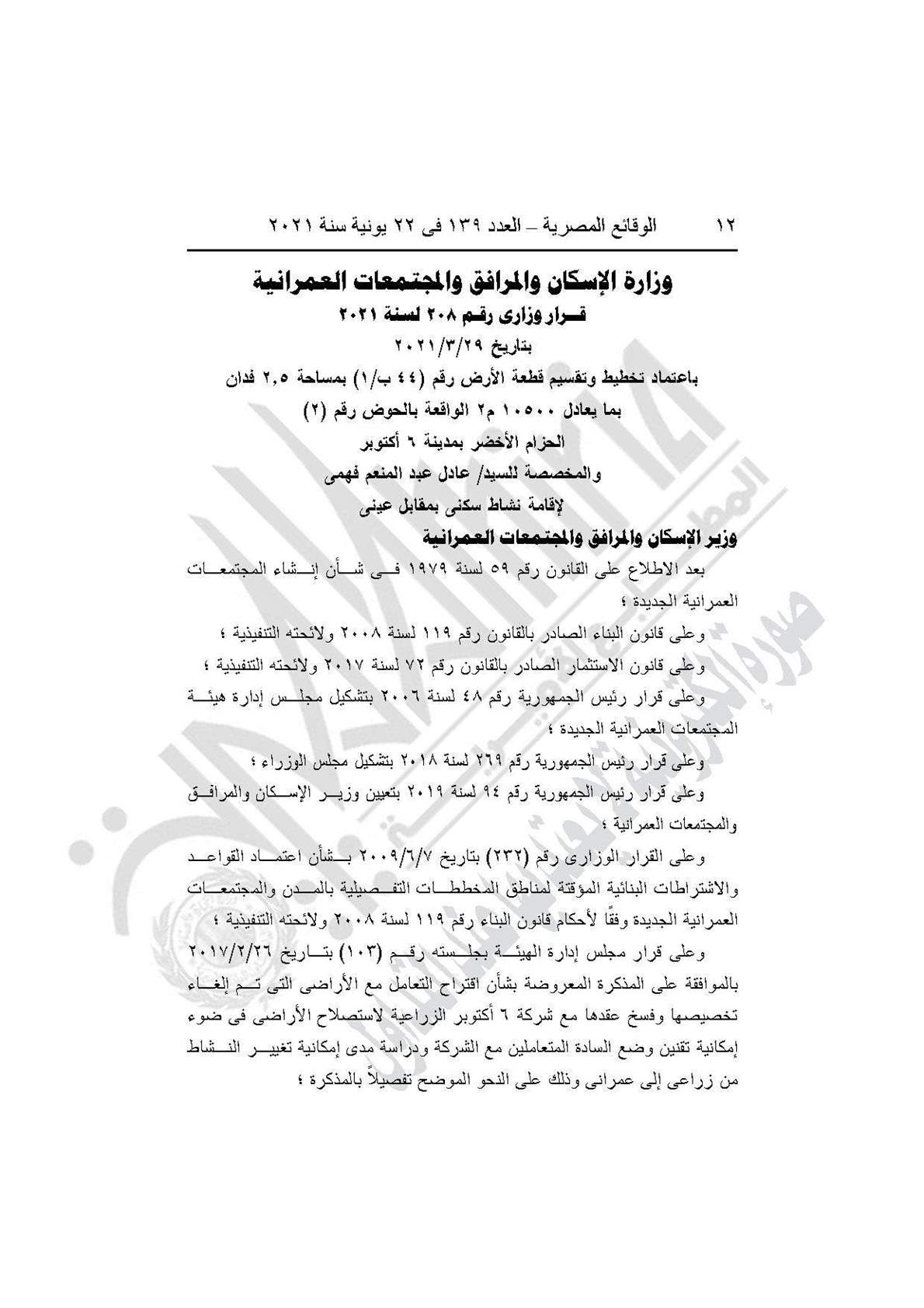 نشرت جريدة الوقائع المصرية في عددها رقم 139، الصادر في 22 يونية 2021، قرار وزارة الإسكان والمرافق والمجتمعات العمرانية رقم 208 لسنة 2021، بشأن اعتماد تخطيط وتقسيم قطعة الأرض رقم (44 ب/1) بمساحة 2.5 فدان بما يعادل 10500 متر مربع، الواقعة بالحوض رقم (2) الحزام الأخضر بمدينة 6 أكتوبر، لإقامة نشاط سكني بمقابل عيني.